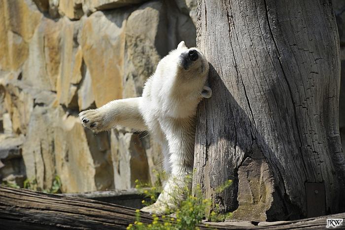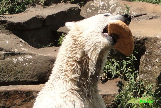 Die großen Eisbären liegen oftmals erst lange auf den heißen Steinen. Meistens toben sie mindestens zwei Mal pro Tag im Wasser, wir haben es auch schon drei Mal gesehen. Dazwischen liegen sie entweder in dem bisschen Schatten, den die Felswand bietet. Katjuscha meistens im Höhleneingang. Da schleppt sie auch ihre Stöckchen, Kokosnussreste oder Futter hin.
