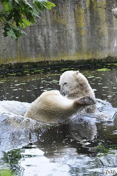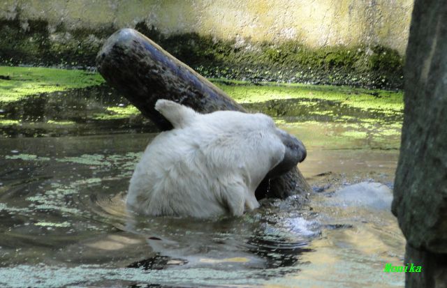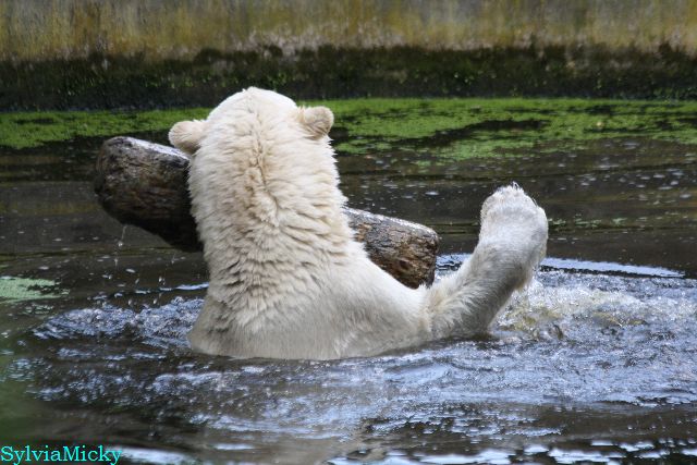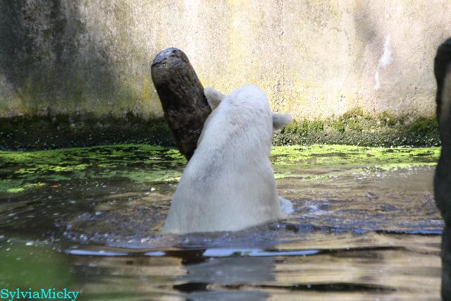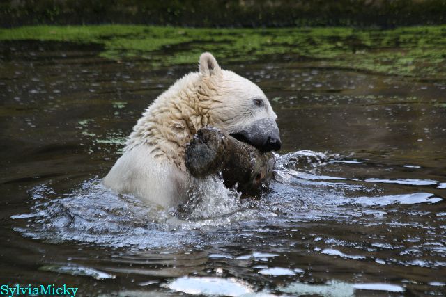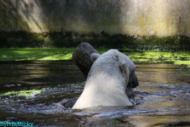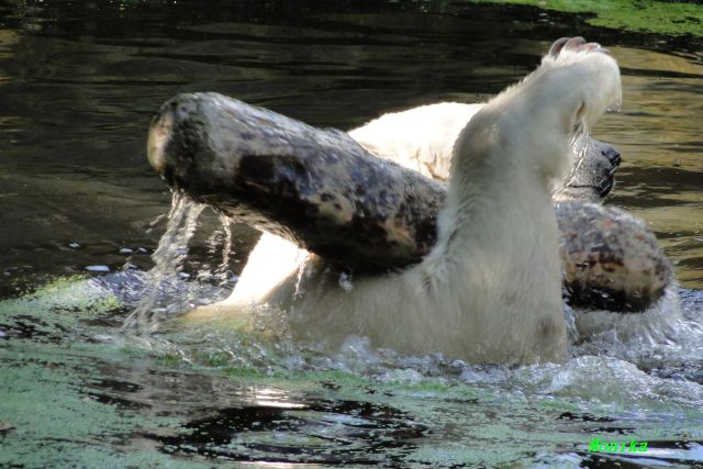 An einem weiteren heißen und schwülen Tag, zeigte Knut wieviel Kraft er trotzdem noch hat. Er schleuderte den großen Baumstamm im Wasser hin und her. Gianna ging auch ab und zu ins Wasser, aber gemeinsames spielen war auch heute nicht angesagt.
