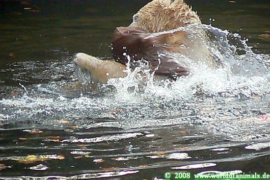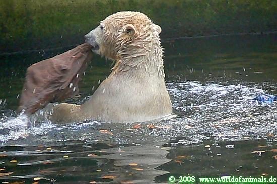 Knut schlief am Vormittag und begann seine Futterwanderung um 11:30 h. Gegen 14:15 h gab es heute bereits die Fütterung durch Markus Röbke. Knut bekam heute reichlich Fisch, aber sein Pfleger machte es Knut nicht leicht, vieles versank zunächst im Wasser, was Knut überhaupt nicht gefiel. Das hieß ja: Ab ins Wasser, was er heute nicht so wollte. Die Fütterung war schnell vorbei, Knut irgendwann im Wasser. Knut schwamm im Wassergraben auf und ab, hielt seine fotografierenden Fans in Trab. Irgendwann kämpfte er mit dem Jutesack, davon gleich.