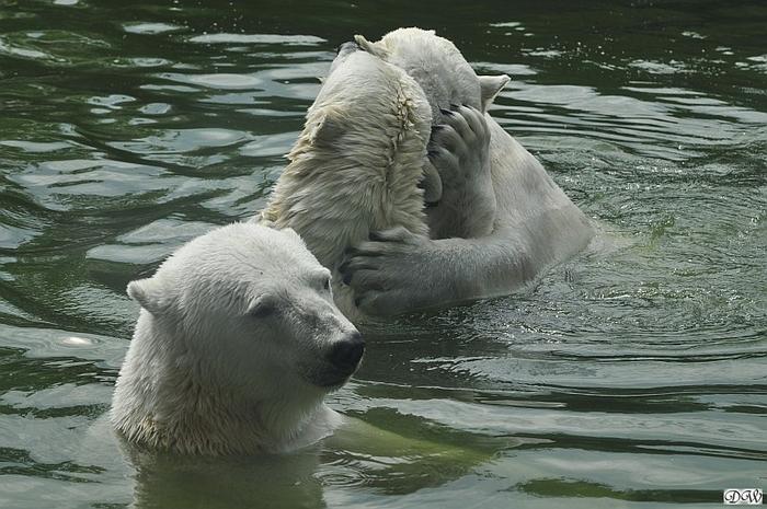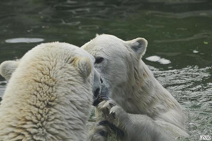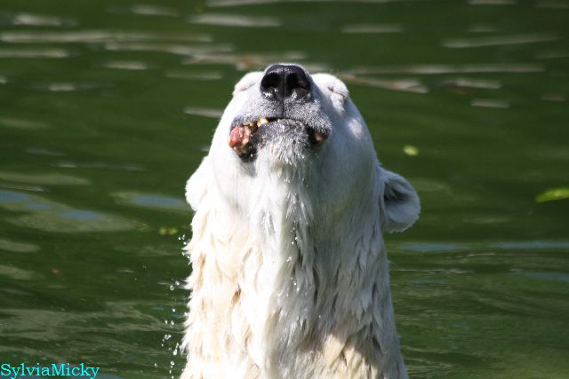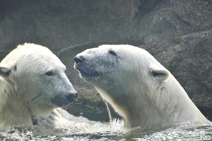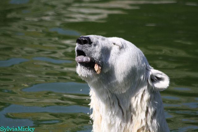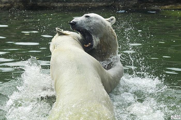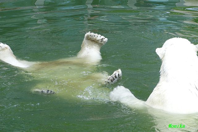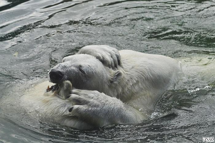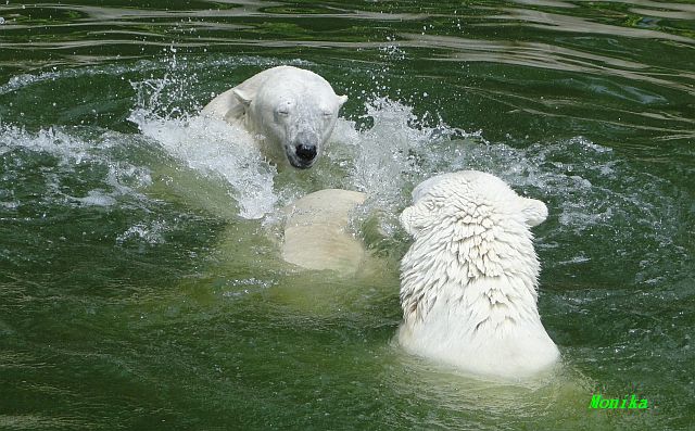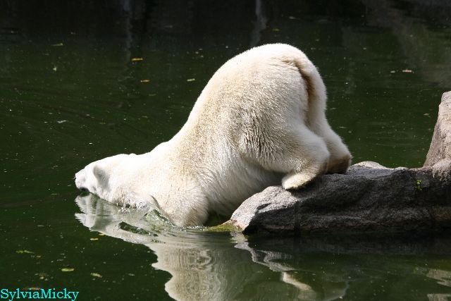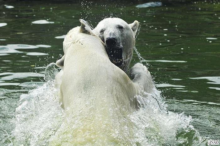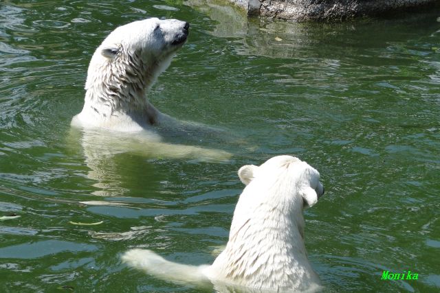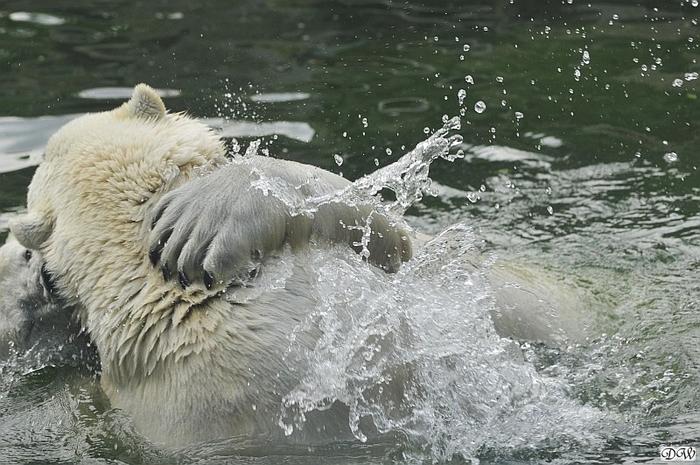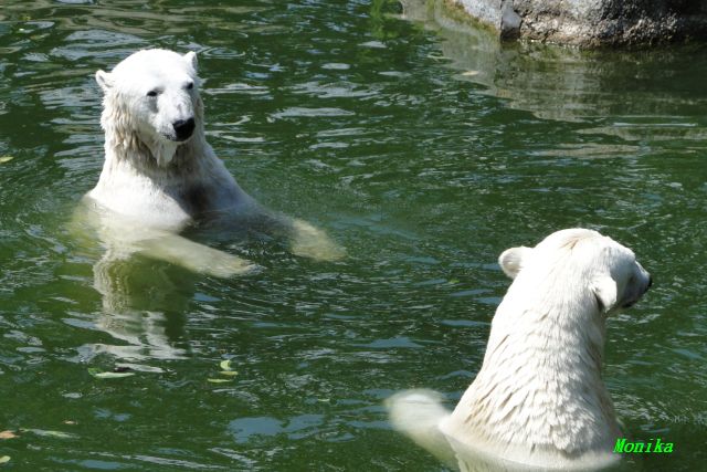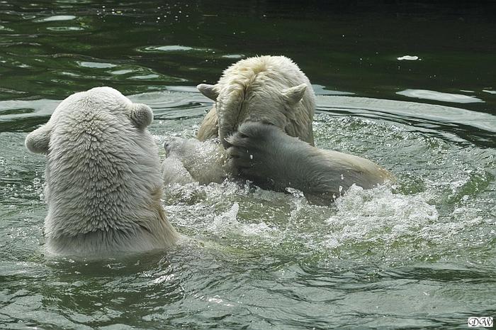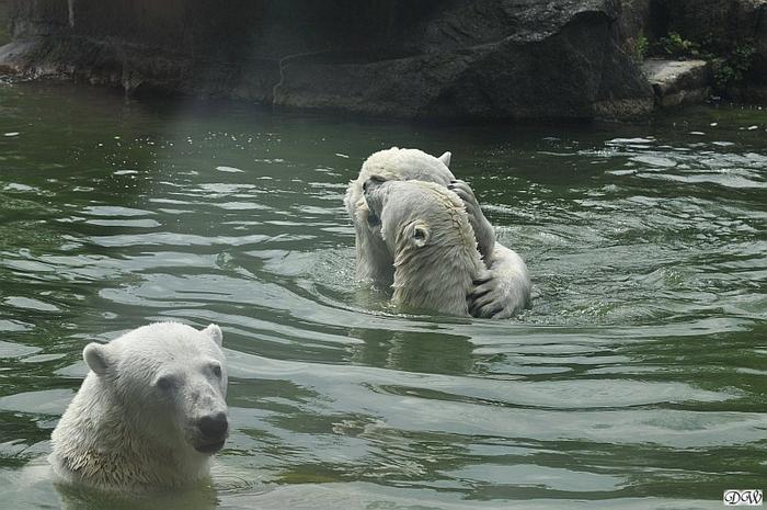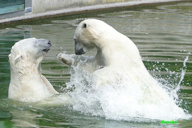 Wasserspiele der drei großen Eisbären. Wie so oft, spielten am Donnerstag erst Nancy und Tosca zusammen und später gesellte sich dann Katjuscha dazu. Ganz verschieden ist die Verweildauer. Manchmal verlässt Tosca nach ausgiebigem Toben das Trio. Dann spielen Nancy und Katjuscha weiter. Gestern kam Katjuscha später und ging dann auch wieder als Erste. Die Lebensfreude ist ihnen auf jeden Fall anzusehen. Nach den Wasserspielen braten sie oftmals lange Zeit in der Sonne. Danach gehen sie meistens noch einmal ins Wasser und legen sich dann in den Schatten nahe an der Wand. Nancy fast immer an der gleichen Stelle. Katjuscha hat den Höhleneingang sowieso gemietet.