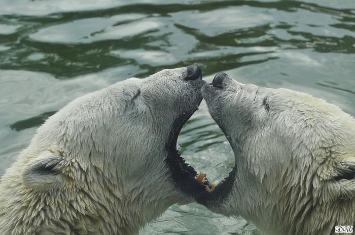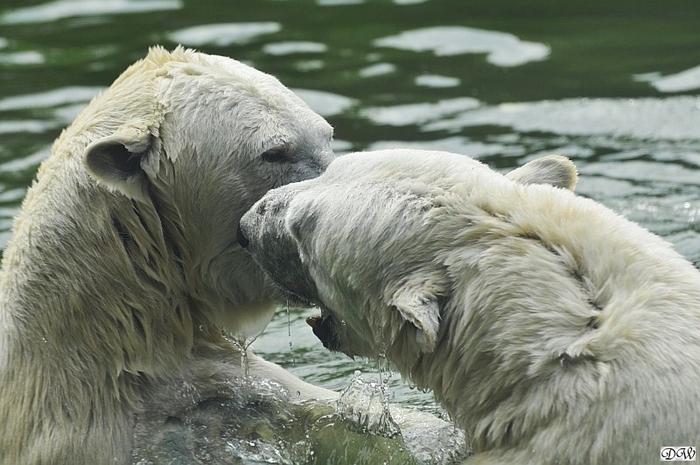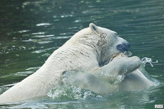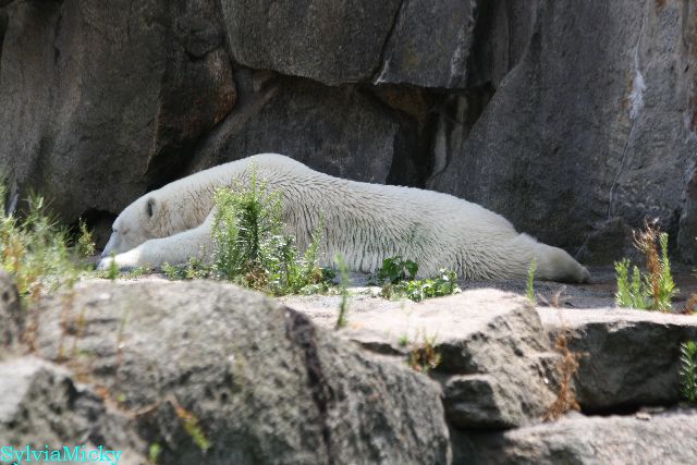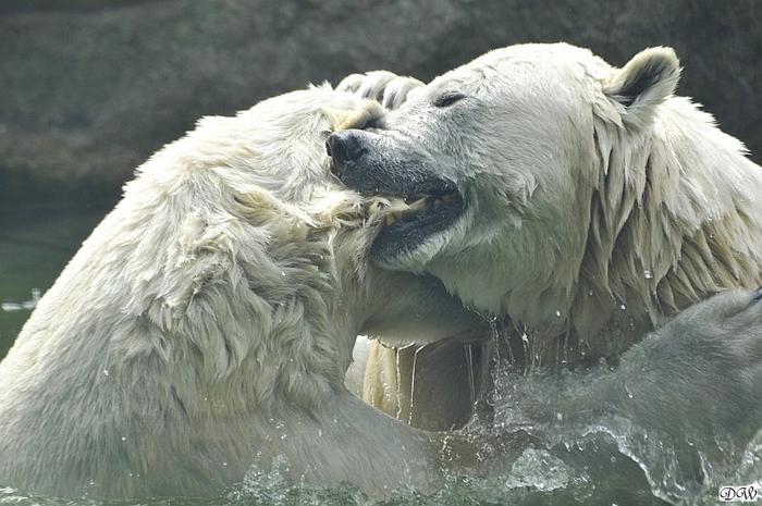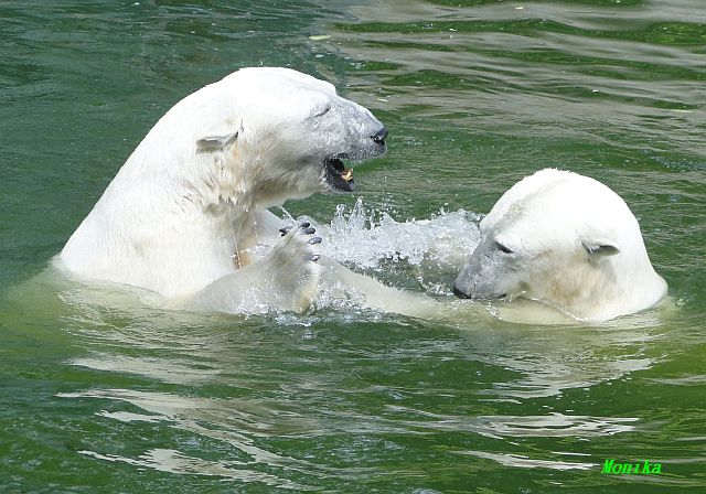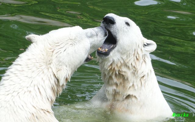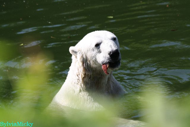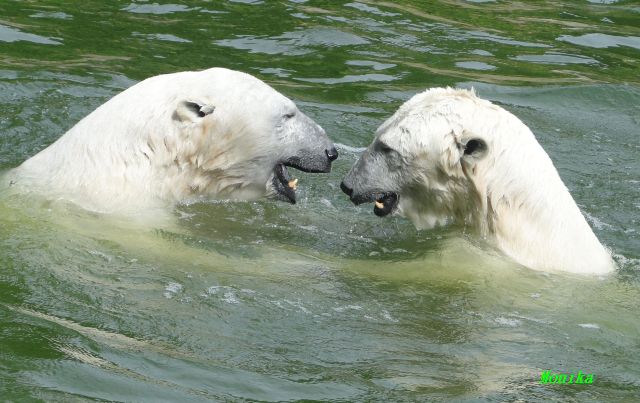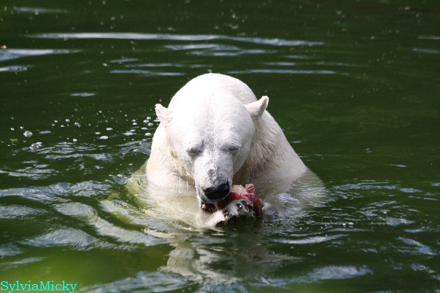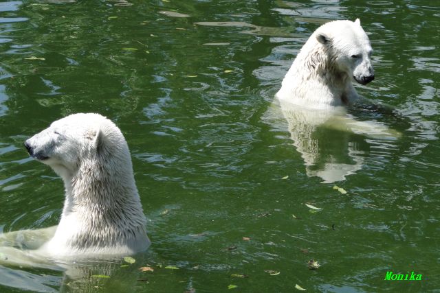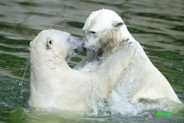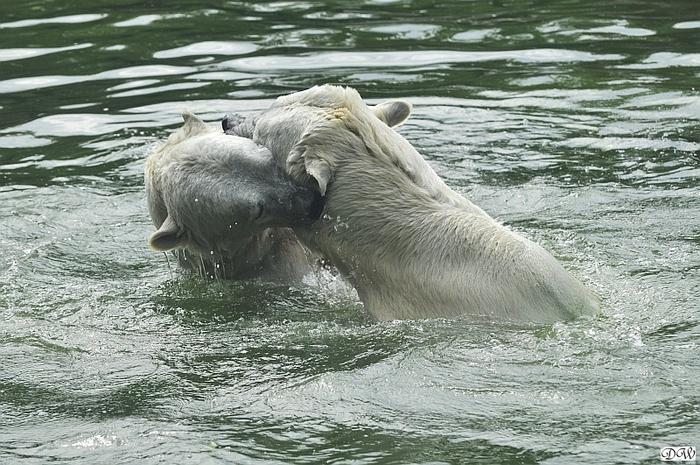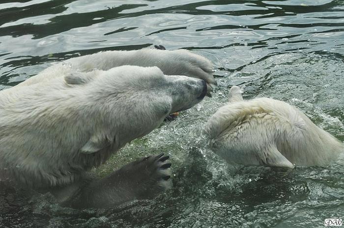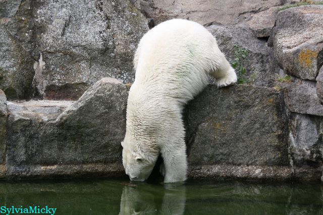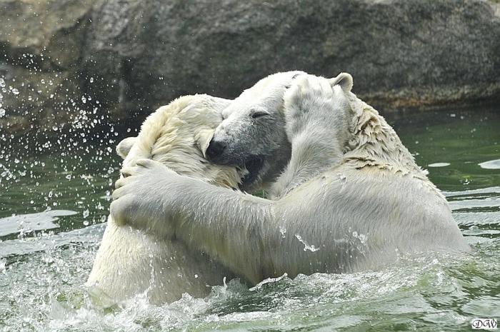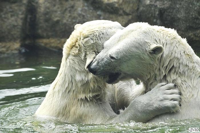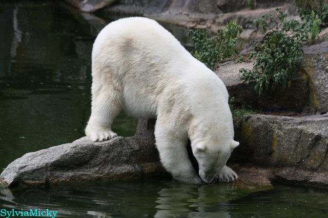 Wasserspiele der drei großen Eisbären. Wie so oft, spielten am Donnerstag erst Nancy und Tosca zusammen und später gesellte sich dann Katjuscha dazu. Ganz verschieden ist die Verweildauer. Manchmal verlässt Tosca nach ausgiebigem Toben das Trio. Dann spielen Nancy und Katjuscha weiter. Gestern kam Katjuscha später und ging dann auch wieder als Erste. Die Lebensfreude ist ihnen auf jeden Fall anzusehen. Nach den Wasserspielen braten sie oftmals lange Zeit in der Sonne. Danach gehen sie meistens noch einmal ins Wasser und legen sich dann in den Schatten nahe an der Wand. Nancy fast immer an der gleichen Stelle. Katjuscha hat den Höhleneingang sowieso gemietet.