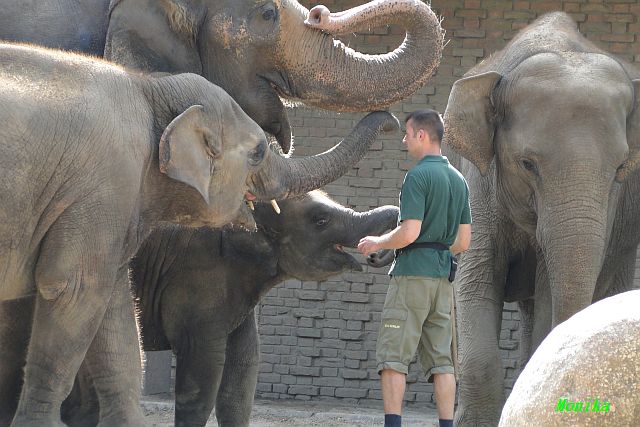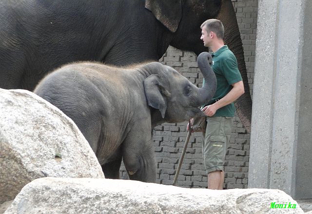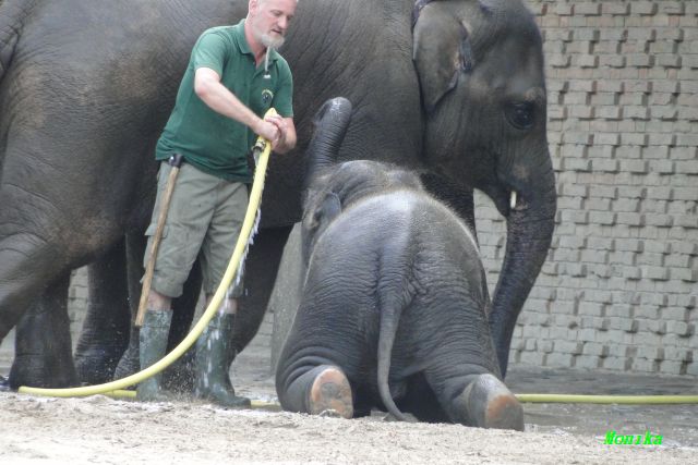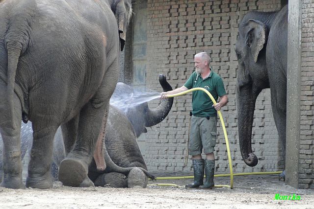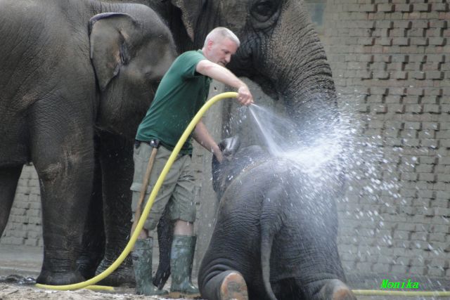 Duschen bei den Elefanten. Während die großen Elefanten zur Dusche anstanden, machte der Pfleger mit Ko Raya und Shaina ein paar Übungen um sie abzulenken. Ko Raya hing dem Pfleger ständig am Hemdzipfel, denn in seiner Bauchtasche waren Leckerlis versteckt.