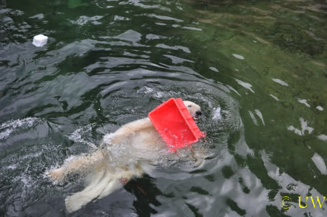 Vera tollte im Wasser herum und steckte den Kopf in die rote Kiste - das hat Flocke auch immer gerne gemacht.