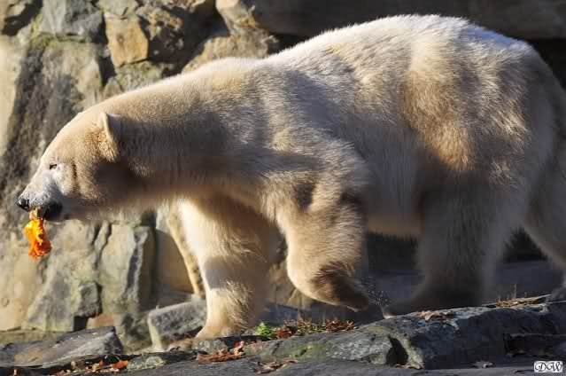 Gianna sorgte fest dafür, dass sie heute in die Höhle kam und nicht Knut. Als sie allerdings zurückkam, führte der direkte Weg nach unten. Knut hatte seinen Kürbis halb aufgefressen und flüchtete mit dem Rest. Gianna checkte, ob in dem kleinen Pool etwas zu finden war und schaute sogar, ob vielleicht ein Pfleger ihr noch etwas zuwerfen wurde. Frau Weckert war aber schon weg. Also flitzte sie nach oben zu Knut und er - tja, er ließ seinen halben Kürbis fallen und sie verspeiste einen Großteil davon.