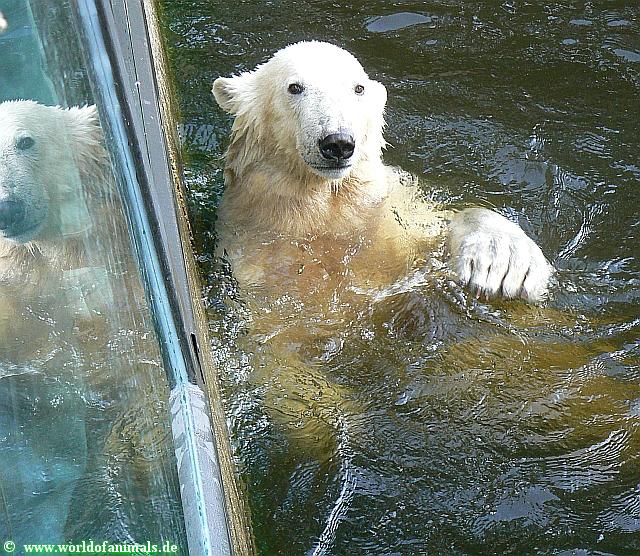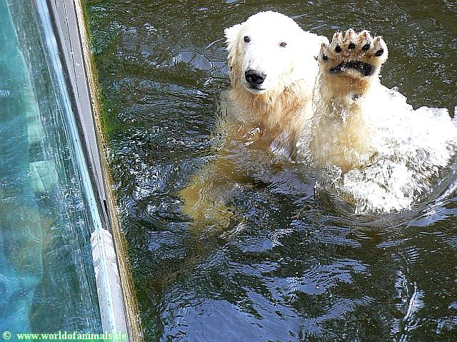 Als ich wieder am Eisbärengehege ankam, bot sich ein nettes Bild: Nancy und Tosca spielten wundervoll zusammen im Wasser. Sie balgten und rangelten. Einmal hielt Tosca ihre Freundin von hinten um den Hals gepackt wie ein Rettungsschwimmer. Allerdings rettete sie sie nicht. Im Gegenteil. Sie tauchte Nancy unter. Mehrere Sekunden waren beide nicht zu sehen.
