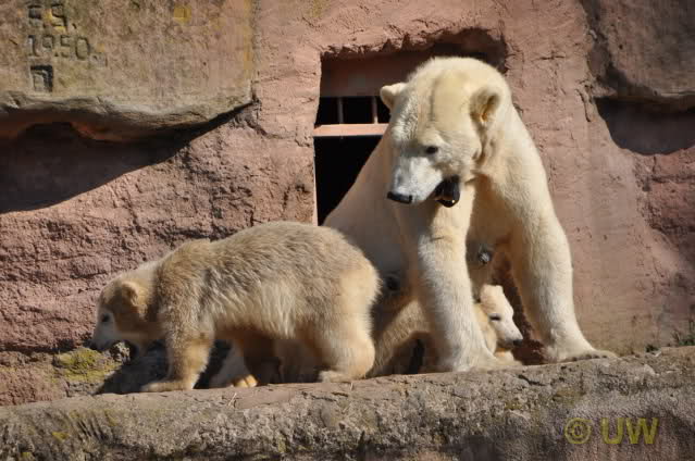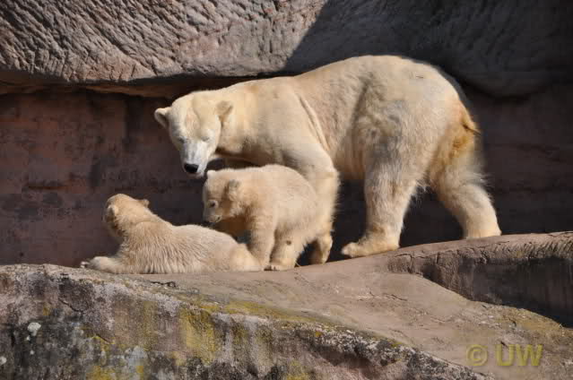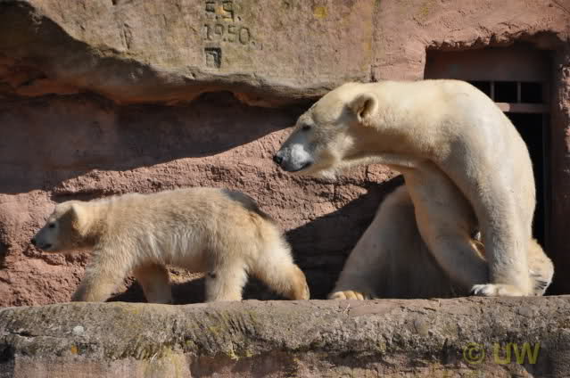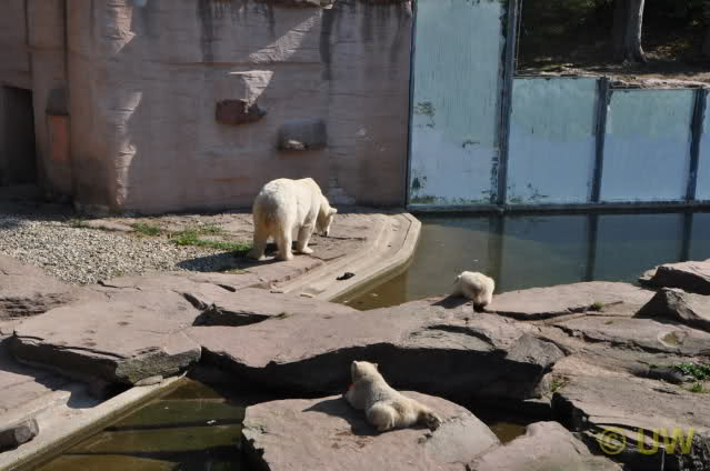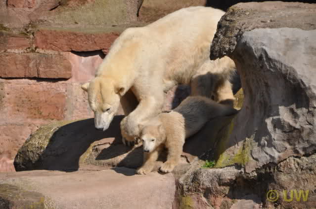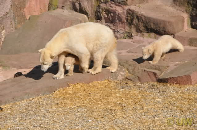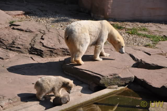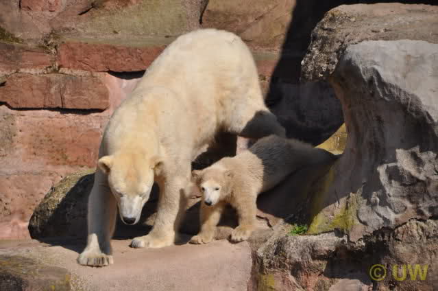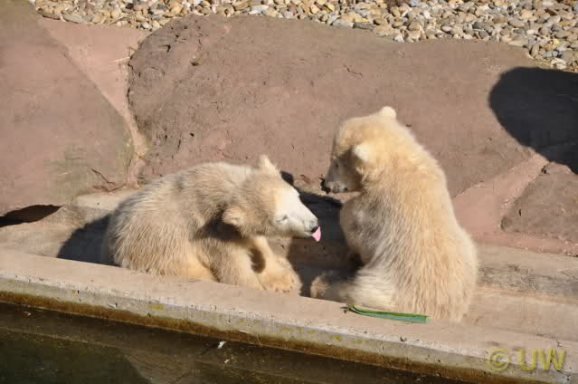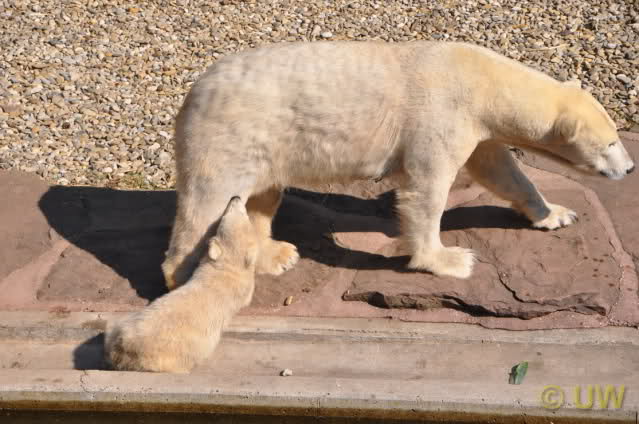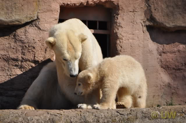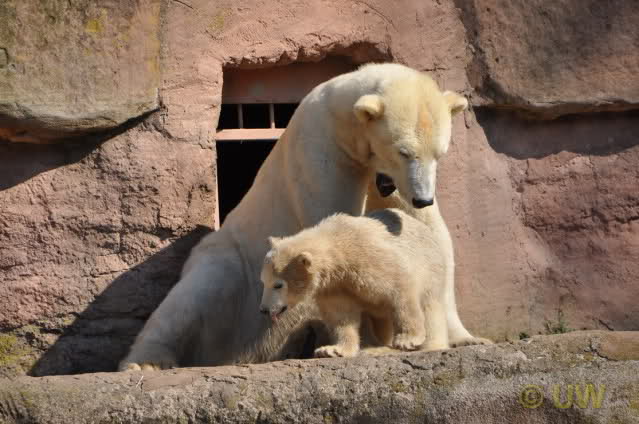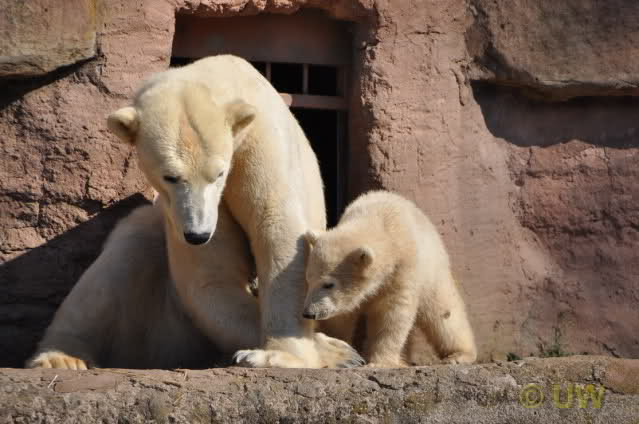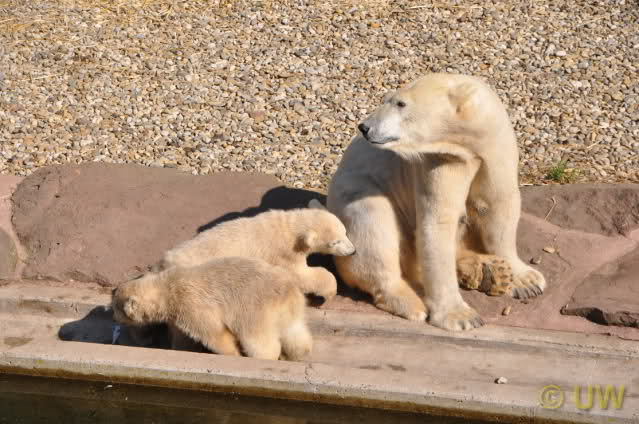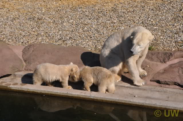 Was fuer suesse Fotos, die sollten mal ein paar Tassen von den bildhuebschen auf diesen Fotos anfertigen (der Zoo). Haben wir uns heute den halben Tag von Berlin nach Nuernberg auf der Autobahn auf Geduldsprobe stellen lassen, sahen wir bei Vera 5 Minuten die Kinder, dann wurden diese von Vera in die Hoehle geschickt und sie versperrte ihnen den Ausgang mit ihrem dicken Hintern. Als nach einer halben Stunde immer noch keine Aenderung der Situation absehbar war, gingen wir schweren Herzens weiter, nahmen noch eine Tasse mit (damit meine Kinder jeden Tag die Baerchen sehen) und quaelten uns bis 22 h zurueck.