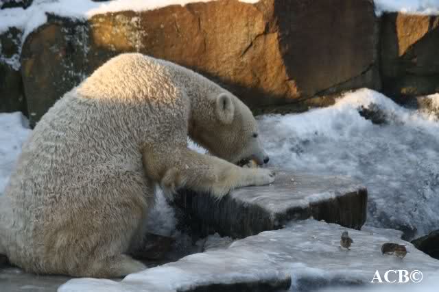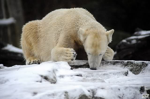 Zwischendurch kletterte Knut immer wieder oben auf seine Anlage. Obwohl die Steine dick vereist waren, ist Knut sehr geschickt im Klettern. Logisch, er ist ja ein Eisbär! Oben angekommen, schnüffelte er im Schnee herum, aß davon und wälzte sich darin herum. Es sieht einfach hinreißend aus, wenn Knut sich im Schnee wälzt!