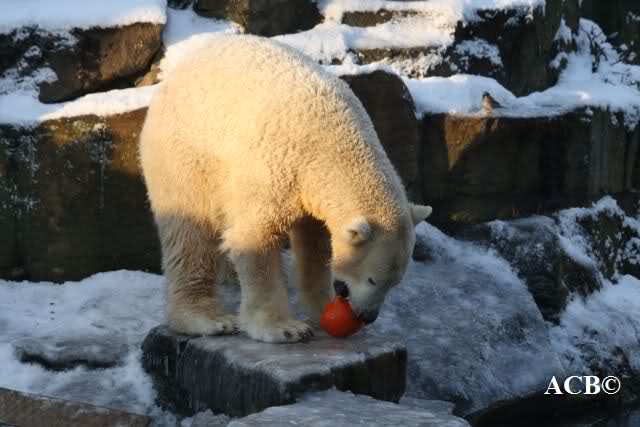 Es sah aus, als wolle er sich die Hände waschen. Knut sah heute sehr schön aus, sein Pelz war ganz sauber. Er hatte sich auch schon ausgiebig im Schnee gewälzt. Aber nun wurde das Wasser bearbeitet. Bald sah ich den Grund für diese Aktivitäten: Ein blau-weiß-roter, schon etwas schlapper Basketball, der im Graben vor sich hindümpelte. Den wollte Knut gern haben. Aber auf Knuts Graben hatte sich eine dünne Eisschicht gebildet, darin steckte der Ball fest. Da konnte unser Liebling so viel Wellen machen wie er wollte, der Ball kam nicht.