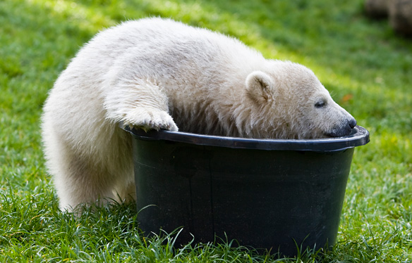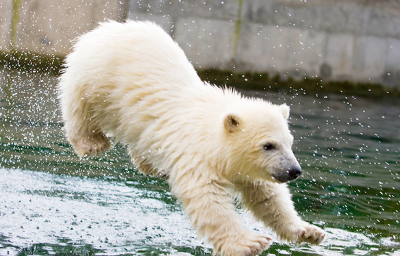 9. Mai 2008: Endlich Sommer, endlich Sonne, endlich warm! Da macht es Flocke doppelt Spaß sich mit Riesensätzen ins kühle Nass zu stürzen. Obwohl sie sich ja auch gern in Sonne und Sand badet... (Foto: Ralf Schedlbauer)