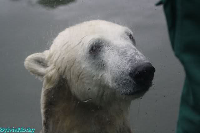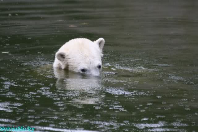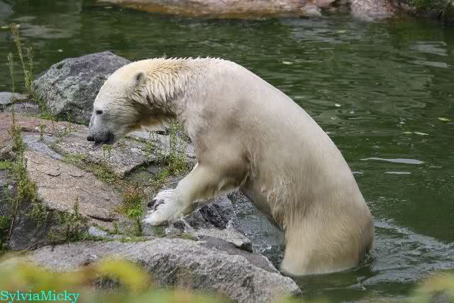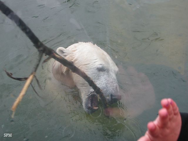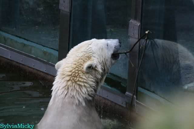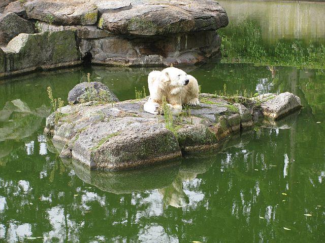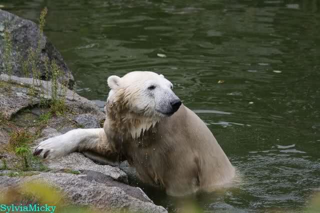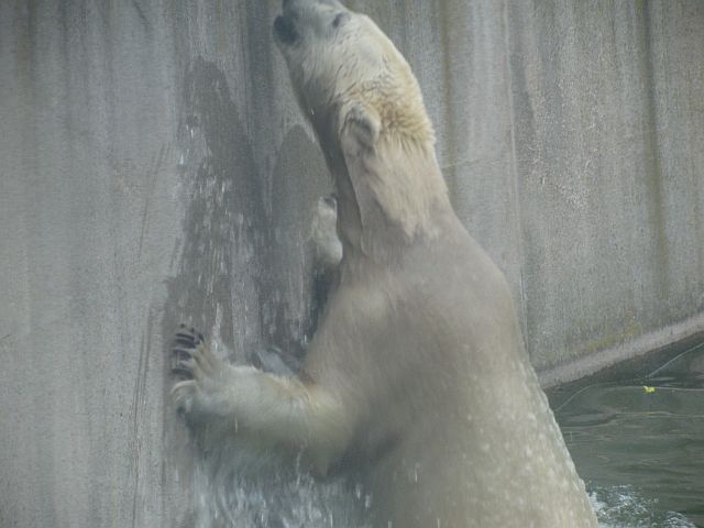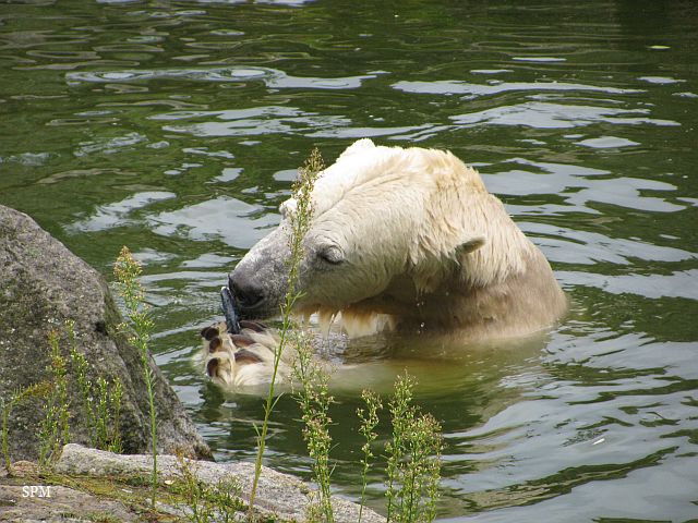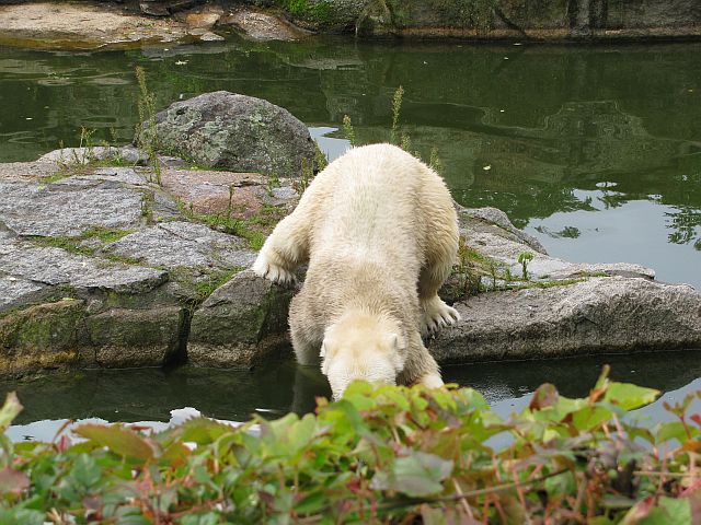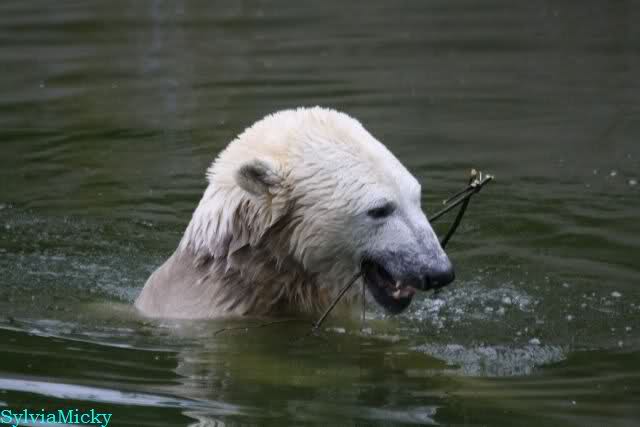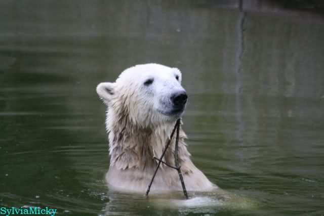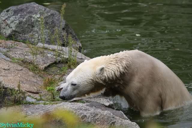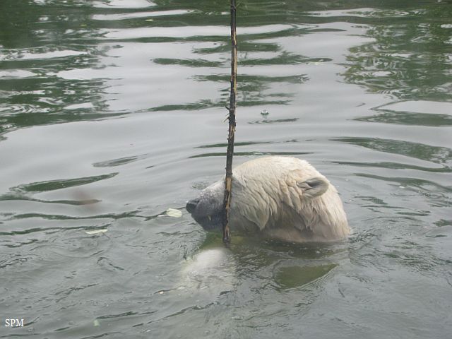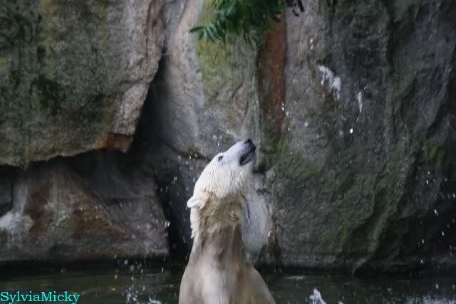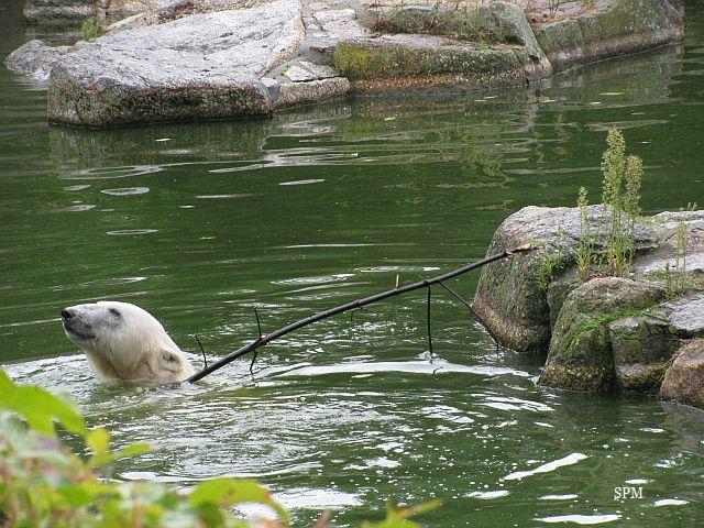Bei strömenden Regen hielt sich Knut von neun bis halb zwei im Wasser auf, nur unterbrochen durch zwei kurze Gänge auf die Anlage. Wobei alle Eingänge kurz inspiziert wurden. Er spielte mit Zweigen, sprang an der Mauer hoch, um an Zweige zu kommen und betrachtete ausgiebig die Besucher. Als er gegen halb zwei auf die Mittelinsel ging (ohne Schwierigkeiten), fielen ihm im Sitzen die Augen zu.