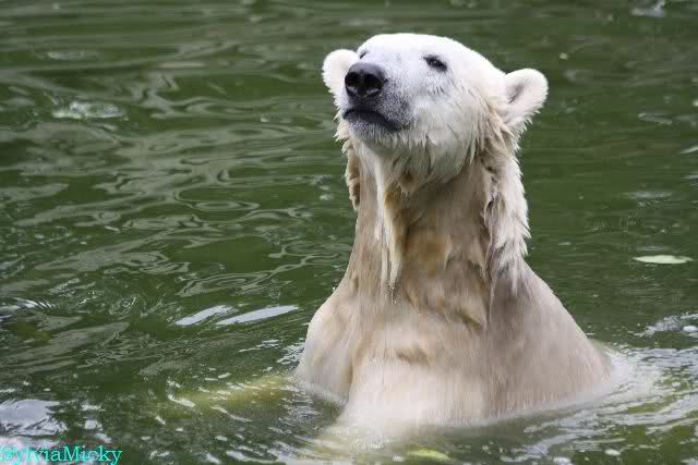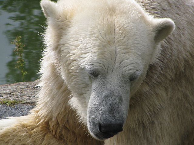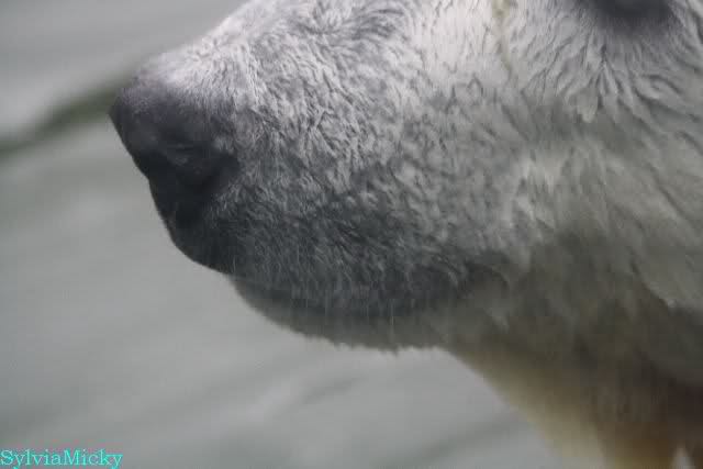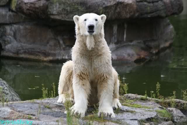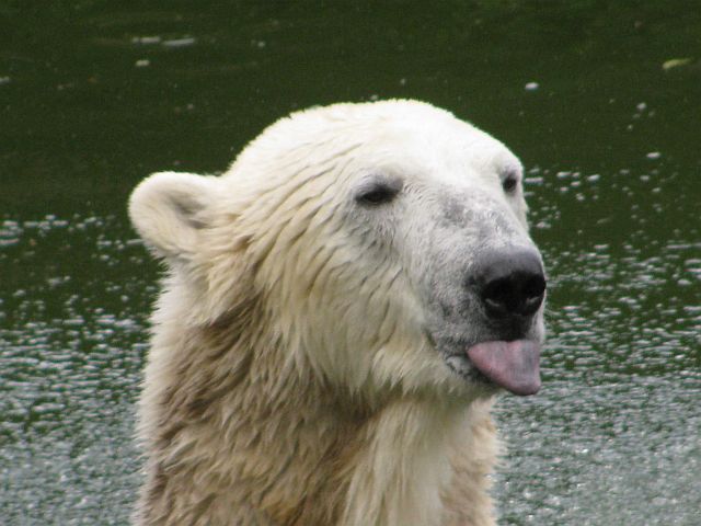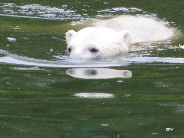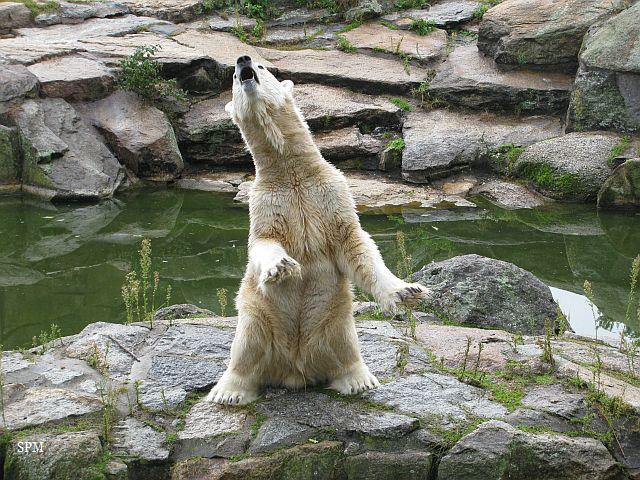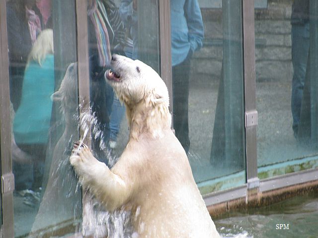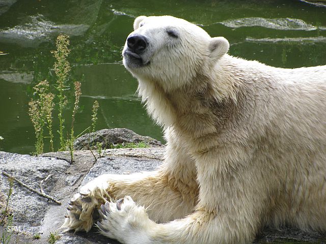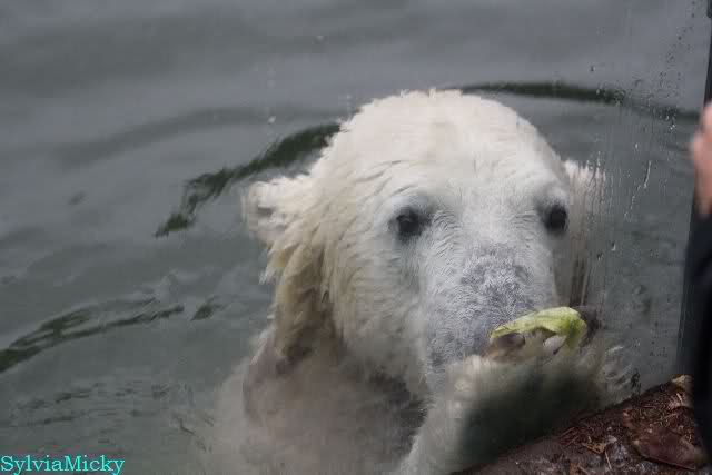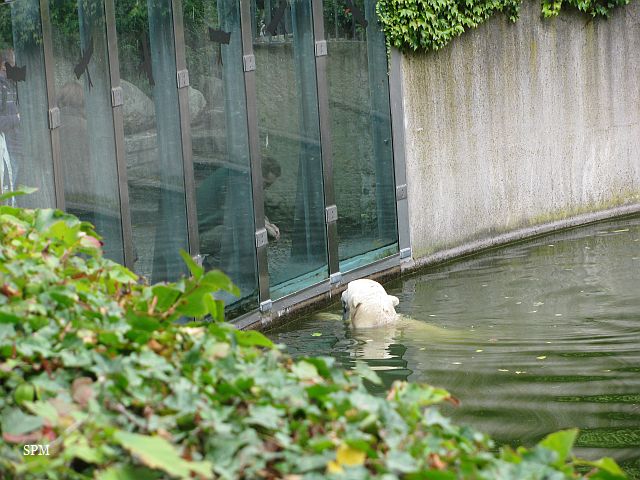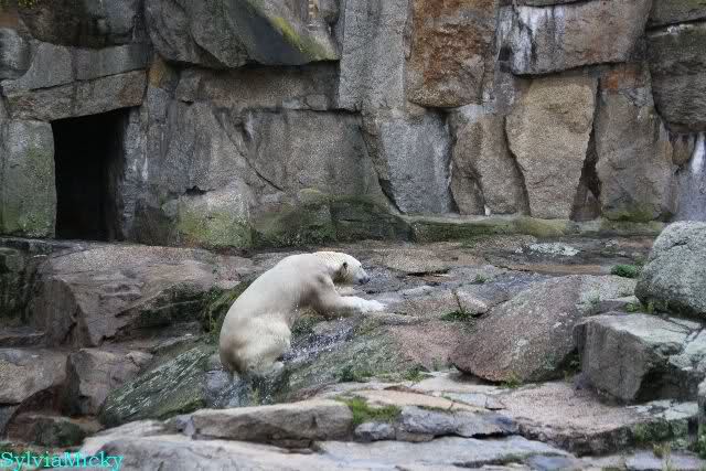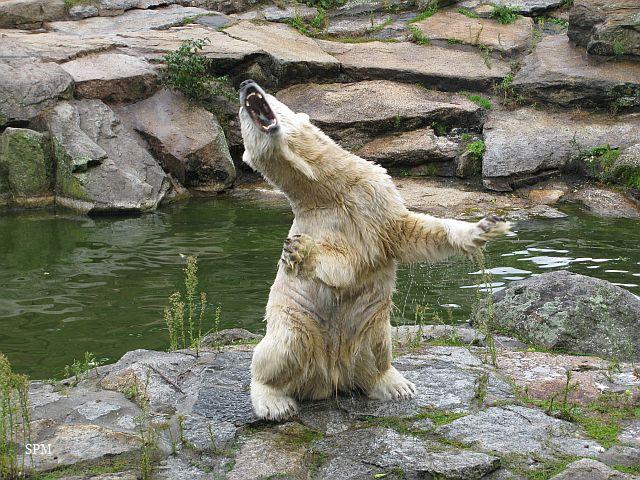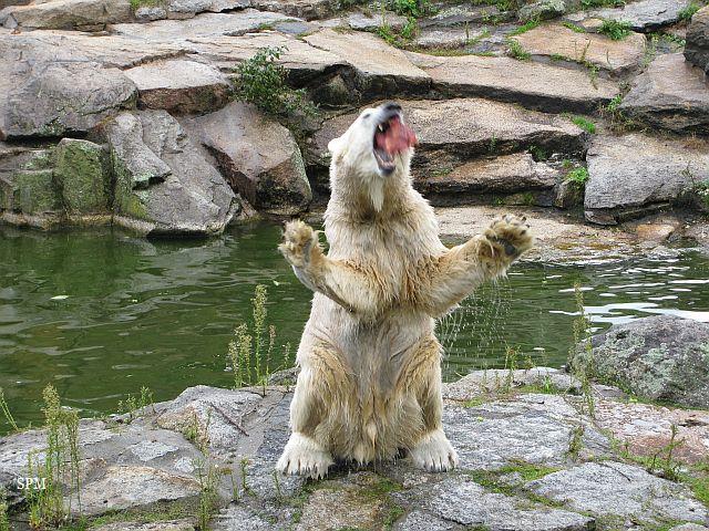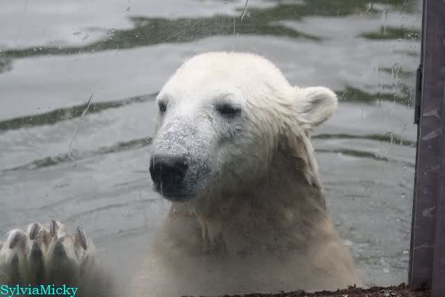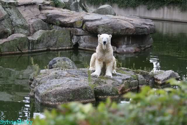 Bei strömenden Regen hielt sich Knut von neun bis halb zwei im Wasser auf, nur unterbrochen durch zwei kurze Gänge auf die Anlage. Wobei alle Eingänge kurz inspiziert wurden. Er spielte mit Zweigen, sprang an der Mauer hoch, um an Zweige zu kommen und betrachtete ausgiebig die Besucher. Als er gegen halb zwei auf die Mittelinsel ging (ohne Schwierigkeiten), fielen ihm im Sitzen die Augen zu.