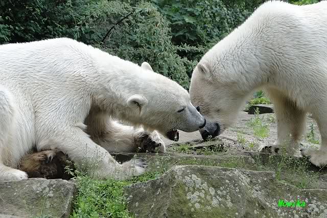 Es war schön wieder im Zoo zu sein. Knut und Gianna waren schön wie immer. Die kleinen Wölfe sind in der kurzen Zeit unheimlich gewachsen. Sie tollen jetzt über das ganze Gehege und versuchten heute einem der Großen eine riesige Rehkeule zu entwenden. Ein Kleiner raste mit einem großen Kaninchen im Schnäuzchen durch das Gras. Mit Papa Pelle schmusen alle Drei gern und er ist sehr zärtlich zu ihnen.