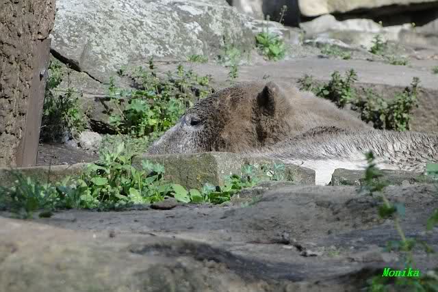 Bei meinem heutigen Besuch am Nachmittag herrschte die verdiente Sonntagsruhe. Da der Zoo heute trotz Kindertag weniger Besucher hatte, wurden die beiden Bärenkids auch nicht zu sehr in ihrer Ruhe gestört. Es war für einen Sonntagnachmittag, bei sommerlichen Temperaturen, richtig angenehm im Zoobereich. Auch die Wölfe schliefen lange, die Jungen waren kaum zu sehen.