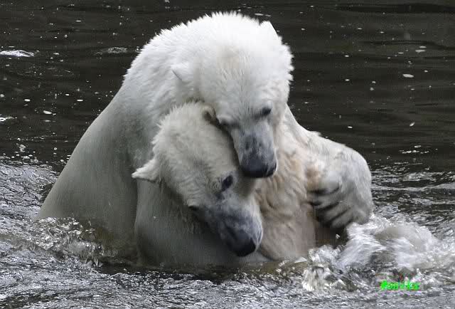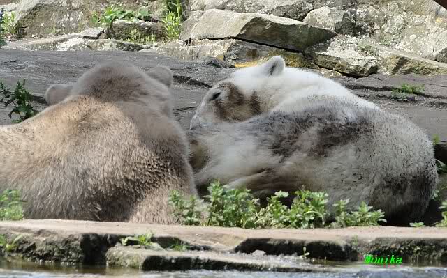 Heute morgen hat Knut noch geschlafen und Gianna lief ihre Morgenrunde. Anschließend legte sie sich neben Knut. Sie robbte sich immer dichter heran. Sie schliefen eine ganze Weile ziemlich dicht nebeneinander. Ein schöner Anblick. Als es mal wieder Zoff bei den Braunbären gab, stand sie auf und ging ins Wasser. Einige Minuten später ging auch Knut ins Wasser und sie tobten gemeinsam.