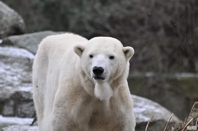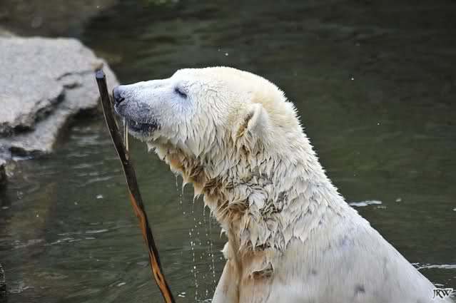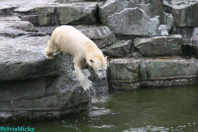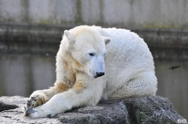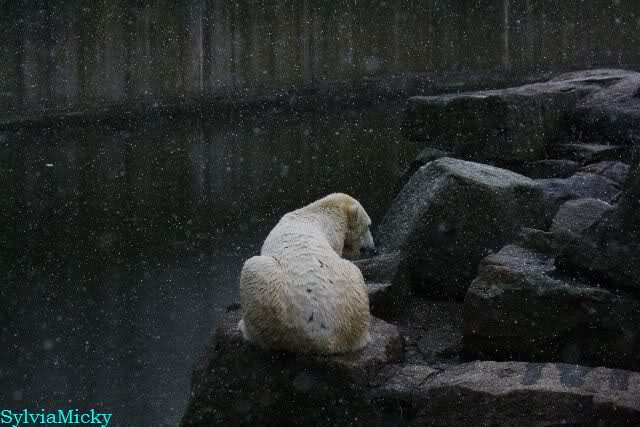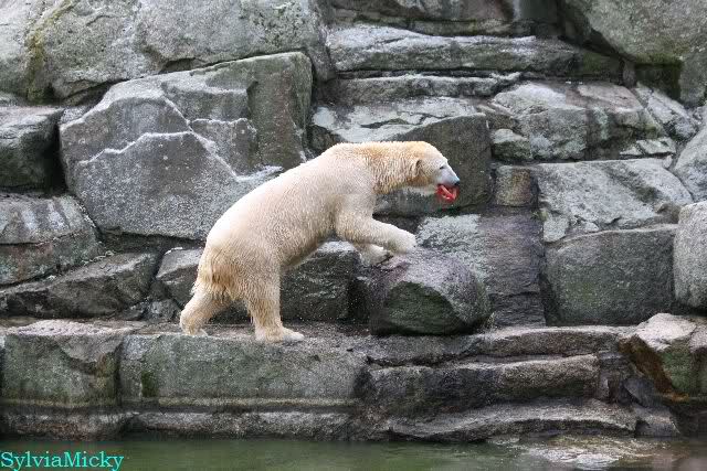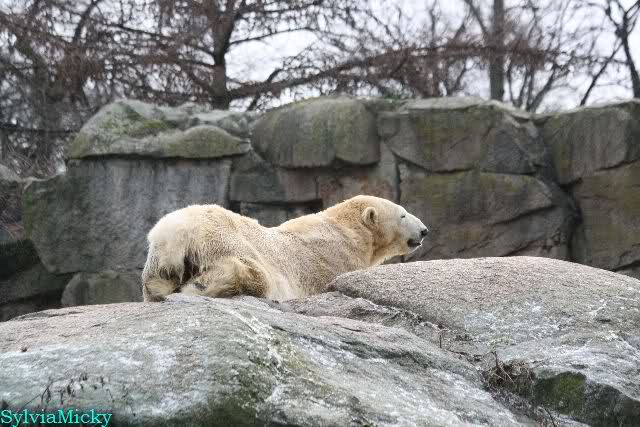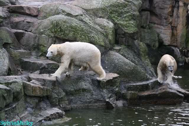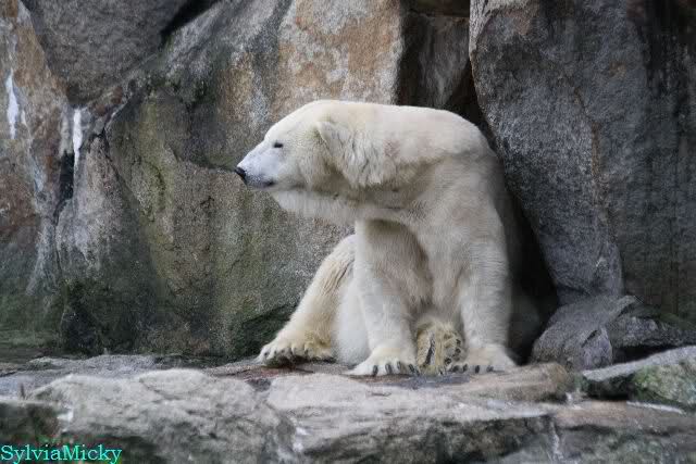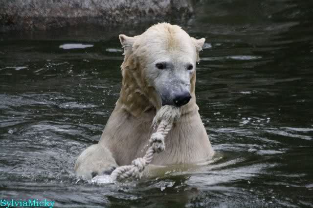 Endlich wieder eine Weile bei Knut. Natürlich hatte er aufgehört zu spielen bis ich endlich zum Gehege kam. Jessie hat noch einige Minuten erlebt. Auf jeden Fall war es gut die Viererbande wiederzusehen. Zerrupft Knut jetzt auch mit den Stanzlöchern im Fell aussieht, ist er noch immer der schönste Eisbär der Welt und wird es auch immer bleiben.