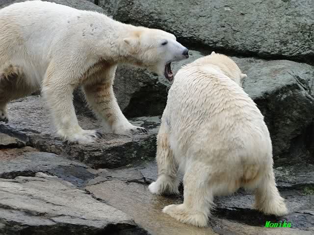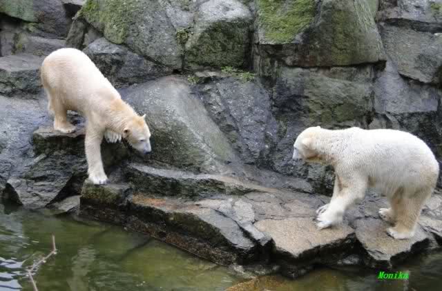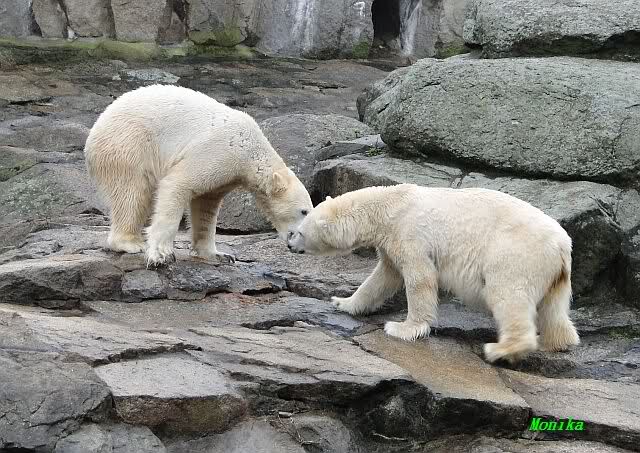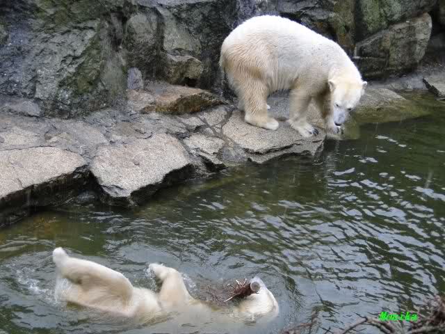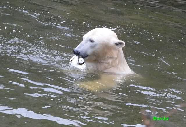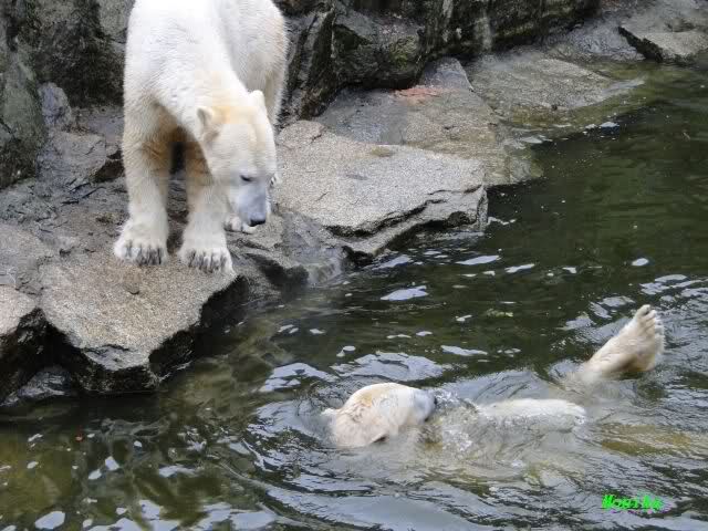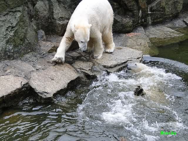 Nach der Fütterung versuchte Tosca alles um Knut ins Wasser zu bekommen. Ihr Ideenreichtum war kaum zu überbieten. Aber Knut ignorierte alles und schnaufte auch sie an.