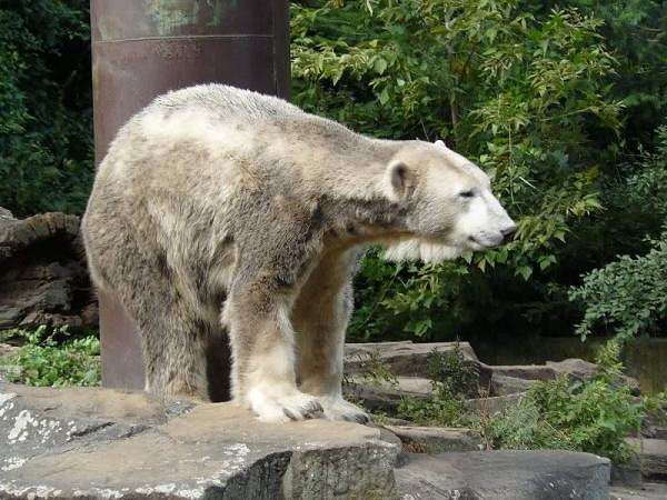 Ich habe die Bilder vom 5.9.2009 durchgesehen. Damals war Knut allein auf der Anlage. Er hatte kein Stress, aber sein Fell sah nicht anderes aus, als jetzt. Ich weiß nicht warum Knuts Fell so schlecht aussieht. Knut ist auch dünner, als die anderen männlichen Bären in seinem Alter.