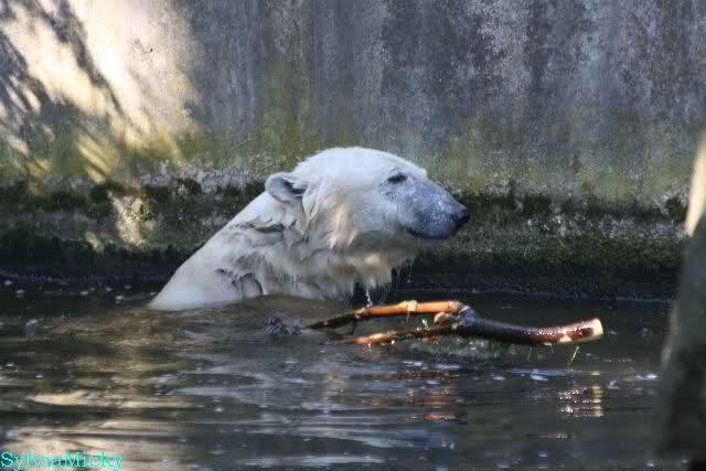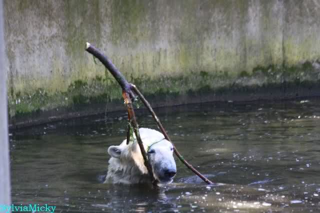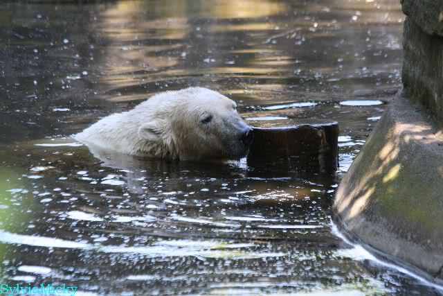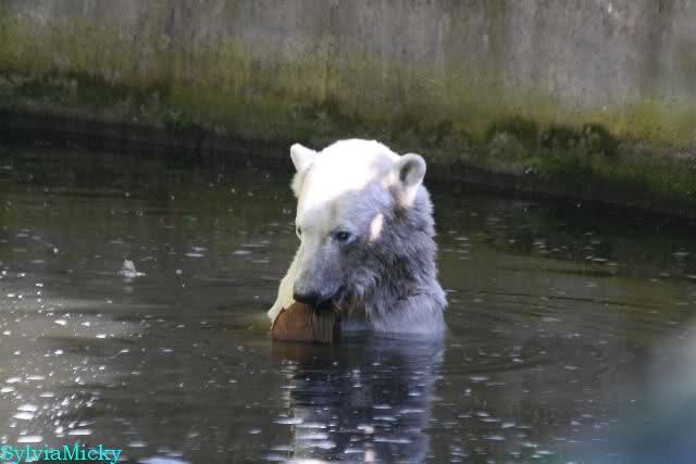 Ich war heute von 9.00 bis 12.00 im Zoo. Knut tobte die meiste Zeit im Wasser. Er spielte mit einem großen und kleinen Stock, dem Huhn, den Kugeln, den Holzscheiben und dem Baumstamm.