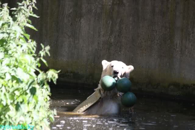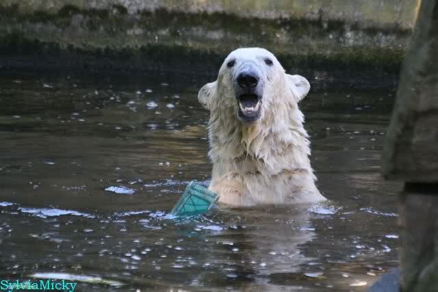 Ich bleibe dabei: Knut braucht ein richtiges vernüftiges großes Eisbärengehege mit frischem Wasser und Rückzugsmöglichkeiten, er braucht größeres Spielzeug, an dem er seine Kräfte messen kann und er sollte auch durch Varianten der Futtergebung spielerisch beschäftigt werden. So wie es in Stuttgart, München, Bremerhaven, Hannover, Nürnberg, Rostock (bald auch in Hamburg) und auch bei den "unseren" Bären in Orsa und Antibes geschieht.