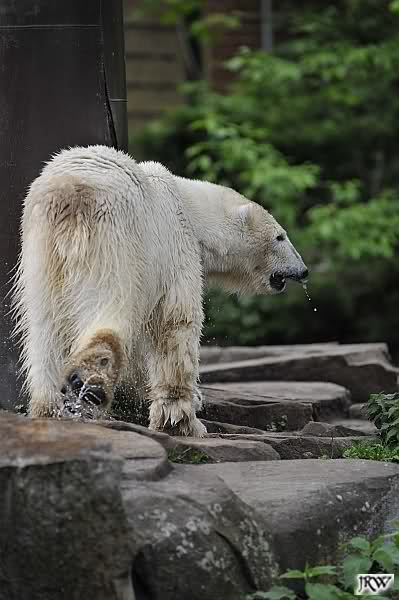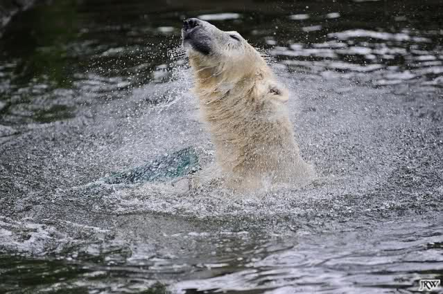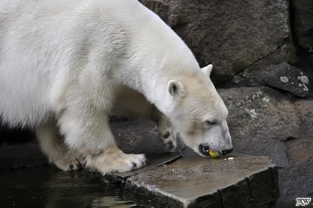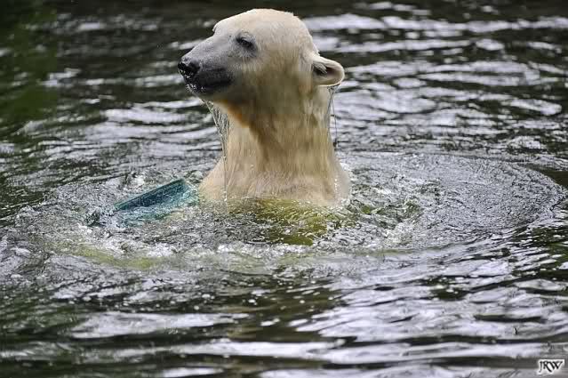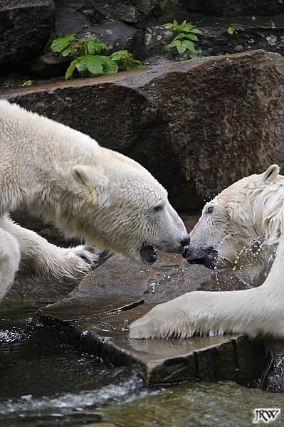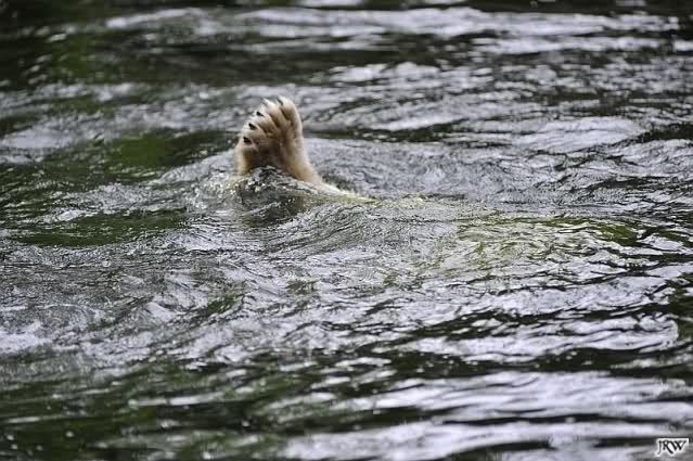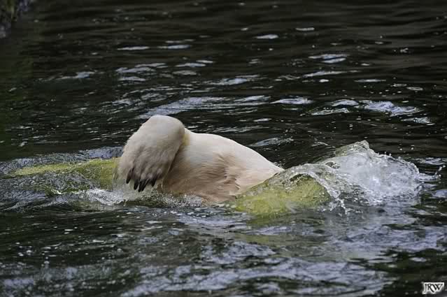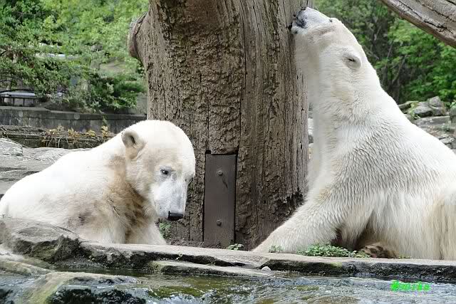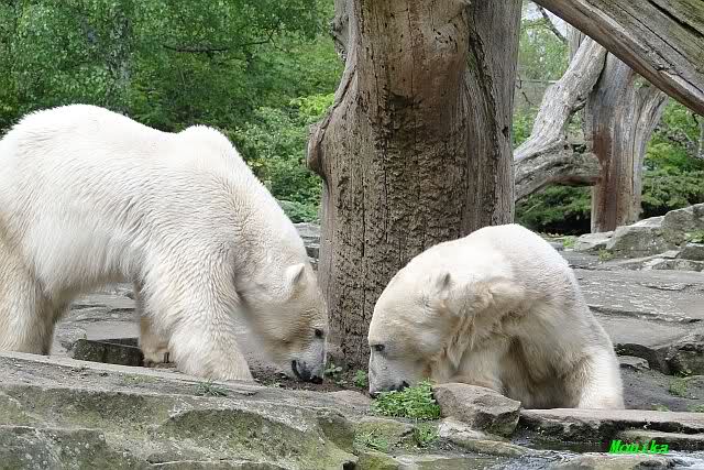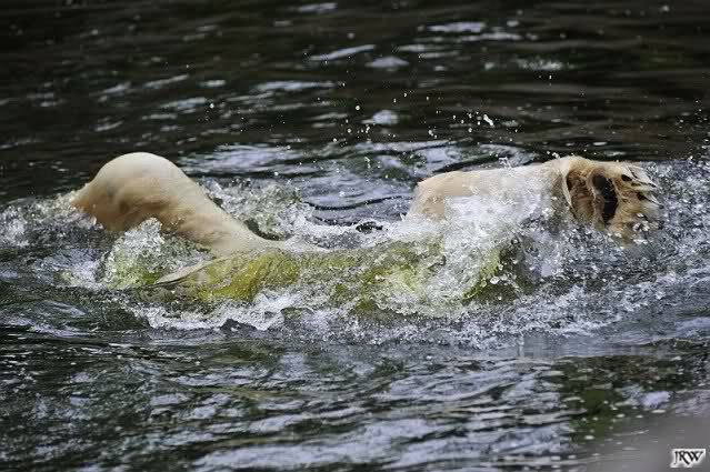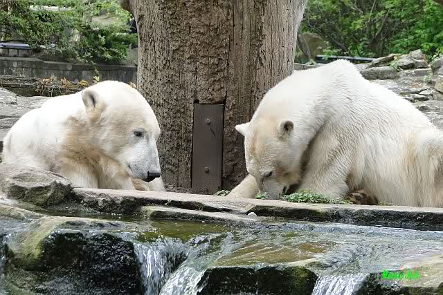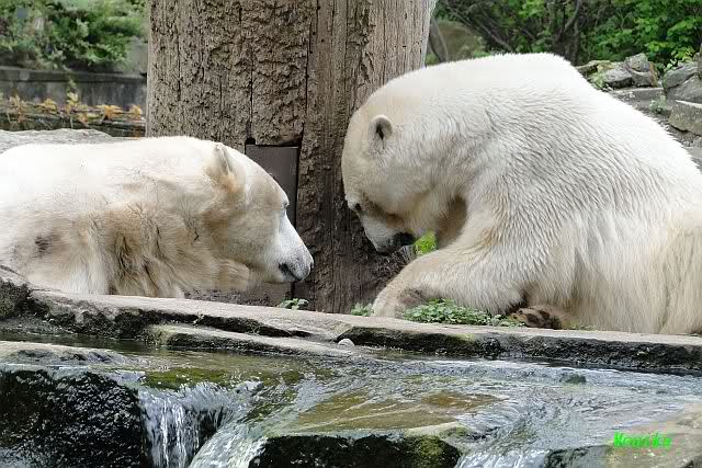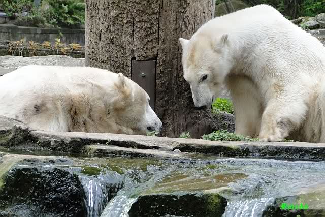 Auch nachmittags wollte Knut nicht schrecklich viel mit Gianna zu tun haben. Dafür spielt er vergnügt allein im Wasser. Sein Blick ging aber trotzdem ab und zu nach oben zu ihr. Als sie dann hinunter kam, brüllte er sie nach kurzer Zeit mächtig an. Vielleicht weil sie seinen Fisch aus dem Wasser geholt hatte? Knut hatte eine Lachsforelle bekommen und Gianna leckte den „Tisch“ ab. Einen Apfel fand sie und dann sah sie einen Fisch, den sie schnell holte und dann erst oben verspeiste. Sie waren beide wieder hinreißend schön.