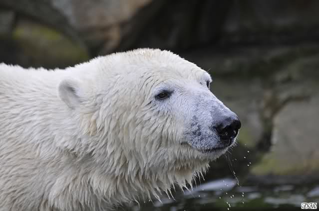 Weil es inzwischen kurz vor halb elf war, ging ich zu den großen Eisbärinnen. Heute beanspruchte Katjuscha die große Insel für sich. Tosca besetzte die kleinere. Nancy blieb am Ufer stehen. So hatte jede ihren Platz und es gab es bei der Fleischverteilung auch keinen Zoff. Die drei Damen haben ausgezeichnete Ess-Manieren. Sie fischen das Fleisch aus dem Wasser und legen es auf den Rücken ihrer Tatzen, wo es dann manierlich verspeist wird.