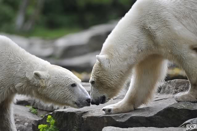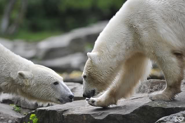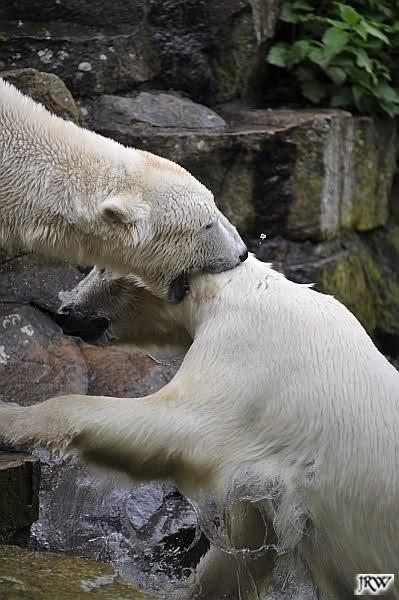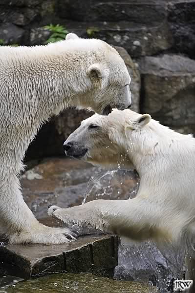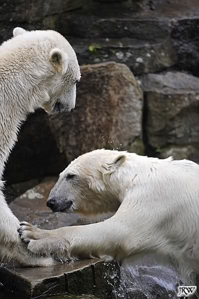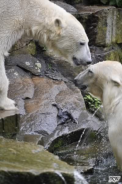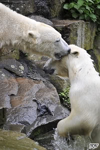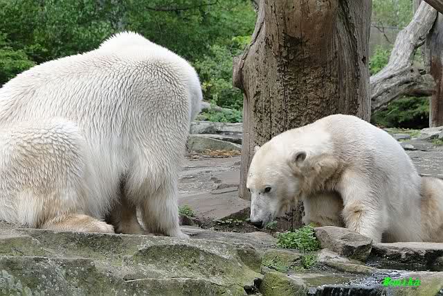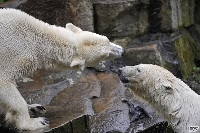 Dann ging ich zurück zu Knut und Gianna. Die beiden waren nun erwacht und wanderten umeinander herum. Mit Spielen und Schmusen war heute nicht viel. Aber Gianna hatte ihr Make-Up vervollkommnet und trug noch zusätzlich schwarze Streifen auf dem Rücken. Sehr schick.