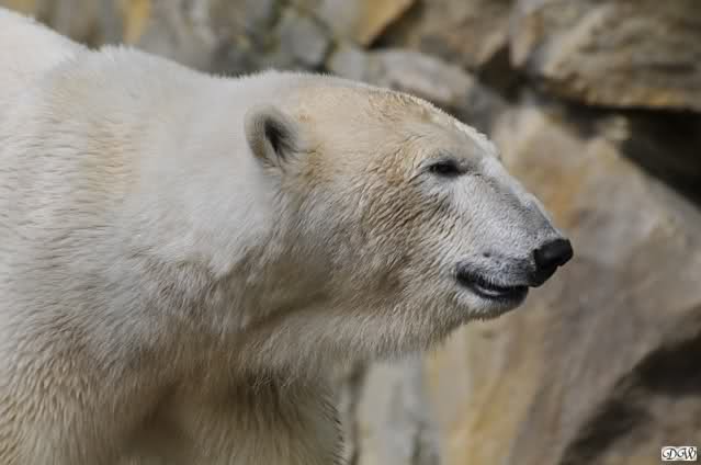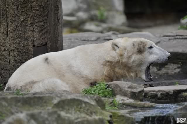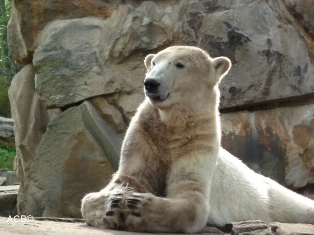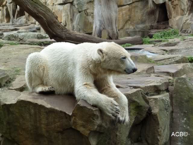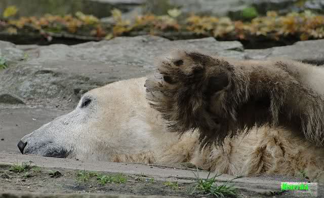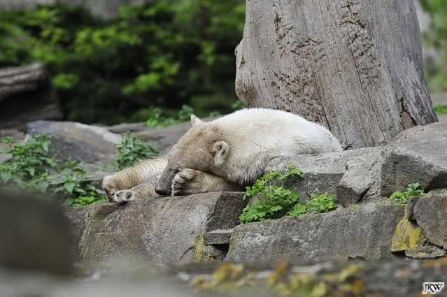 Heute morgen bei Knut und Gianna wie üblich: Knut schläft und Gianna läuft. Als Gianna langsam auf Knut zu ging, wurde sie von ihm angebrummt und verzog sich wieder.
