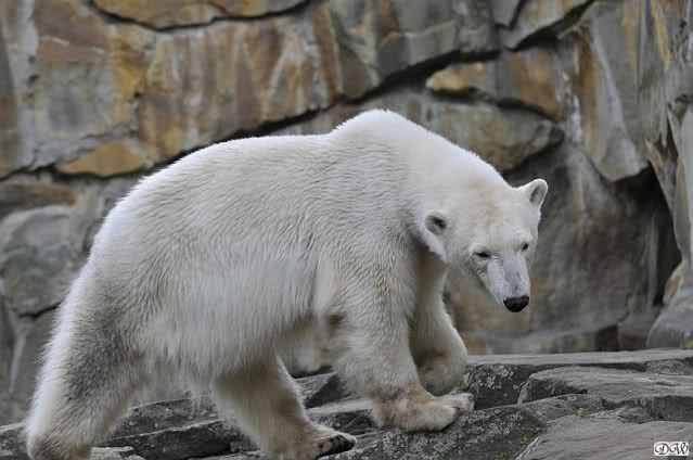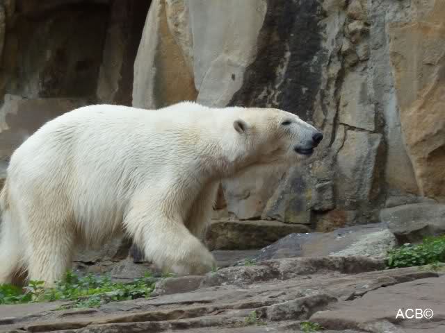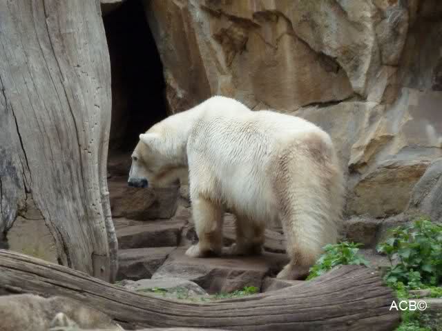 Dann gingen wir zu Knut und Gianna. Während Gianna es sich weiter hinten auf der Anlage gemütlich gemacht hatte, lief Knut vorn immer hin und her. Als er uns sah, steckte er mehrmals die Zunge heraus. Was sollen wir denn davon halten? Zweifellos meinte er uns, denn es war niemand anders mehr am Gehege.