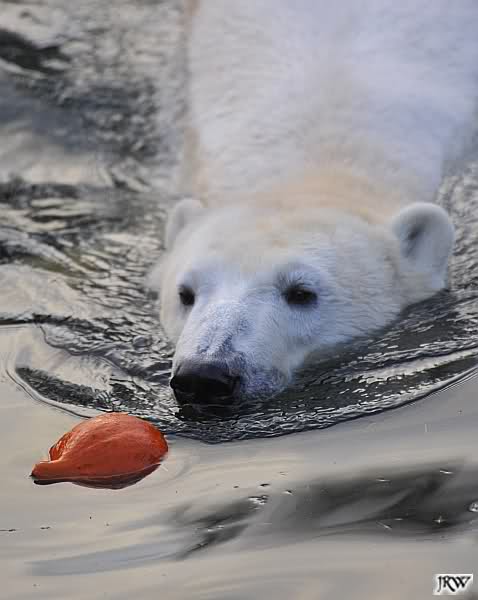 Heute Nachmittag fühlte Knut sich pudelwohl. Herr Röbke warf einen Kürbis ins Wasser, den ihm Besucher gegeben hatten. MR erzählte, dass man Knut jetzt morgens und abends etwas Zeit allein auf der Anlage geben würde, damit er sich wohlfühlen kann. Wie schön für Knut! Erst ruderte Knut ewig lange um den Kürbis an Land zu bekommen. Aber er war zu weit weg. Nachdem er lange Zeit versuchte und versuchte, entschied er sich doch ins Wasser zu gehen. Wie so oft, einmal im Wasser und er kommt dann lange Zeit nicht mehr heraus. Der Kürbis wurde schnell verspeist und dann tobte Knut von einer Ecke des Grabens zur anderen. Je länger er spielte, desto mehr Besucher kamen um ihm zuzusehen und sie waren eine Weile ständig in Bewegung, da er wirklich den gesamten Graben zum Spielen nutzte und die Leute immer hinterher laufen mussten um ihn nicht aus den Augen zu verlieren.