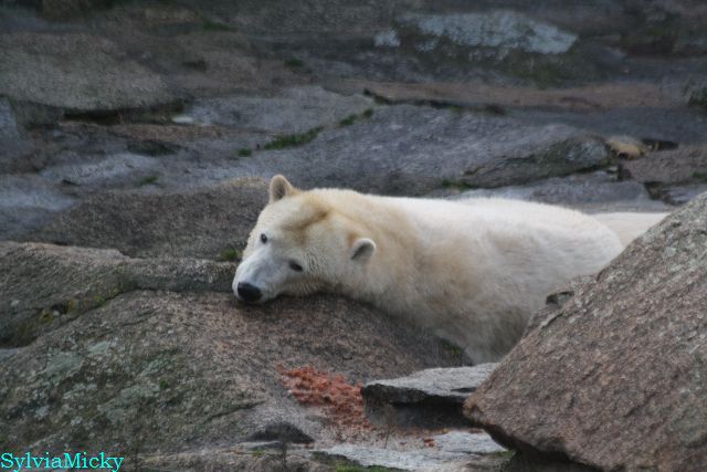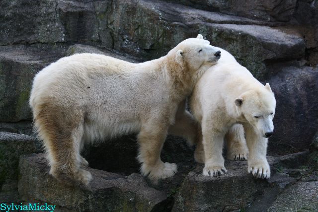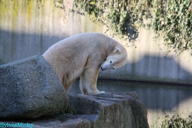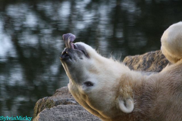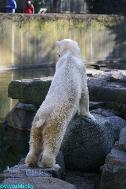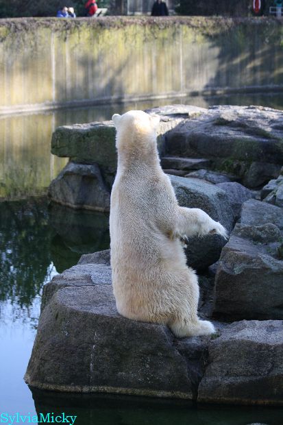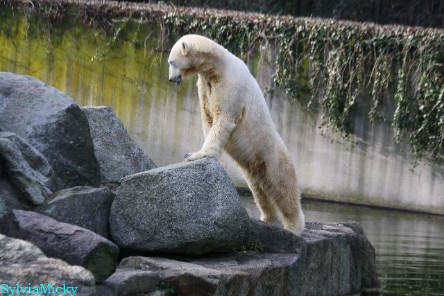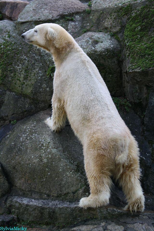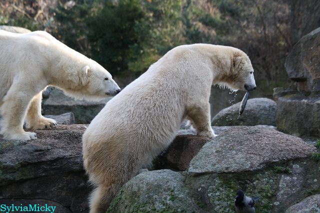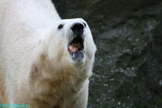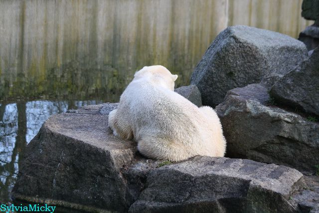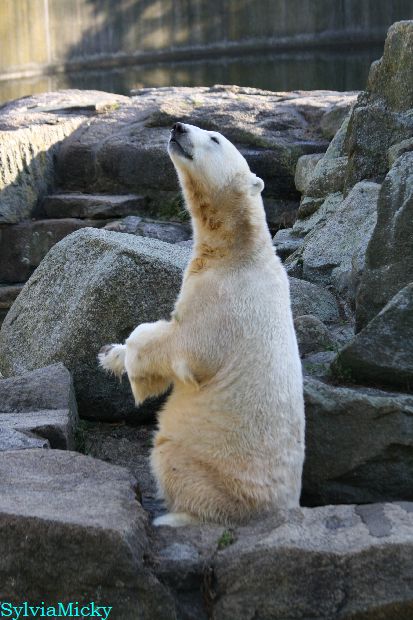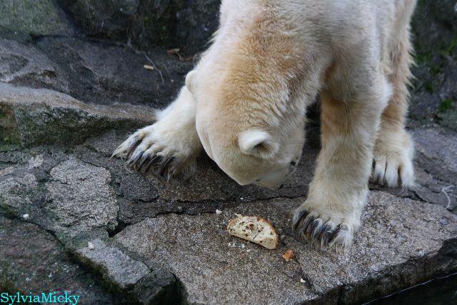 Knut ging danach auf die Anlage und stieg auf einen der hohen Felsen. Da kam Kati an. Sie stellte sich mit den Vorderpfoten an den Felsen und hob ihre Vorderpfote und brüllte laut. Knut brüllte mächtig zurück. Sie machte kehrt, ging dann doch wieder hin. Diesmal gab Knut nach.