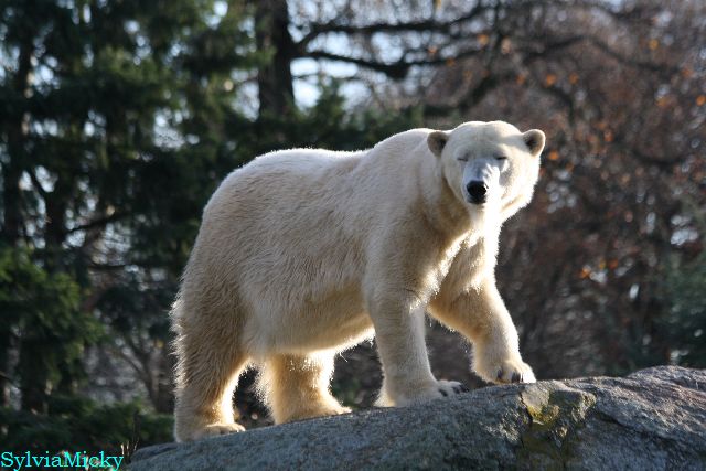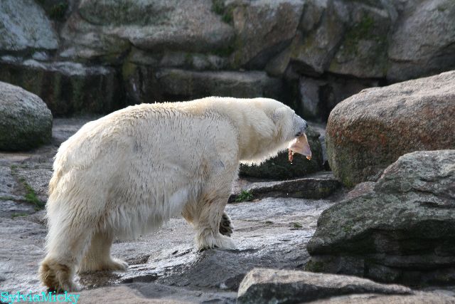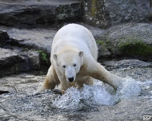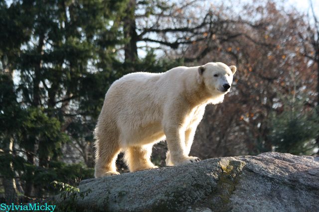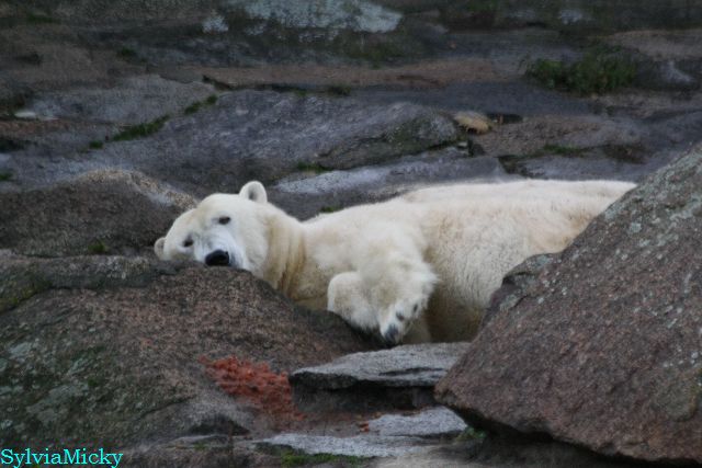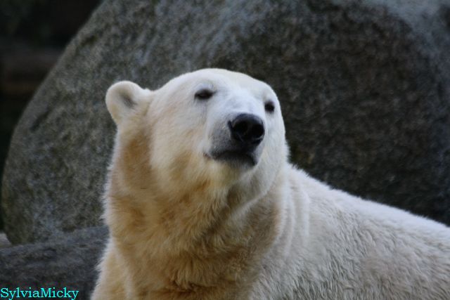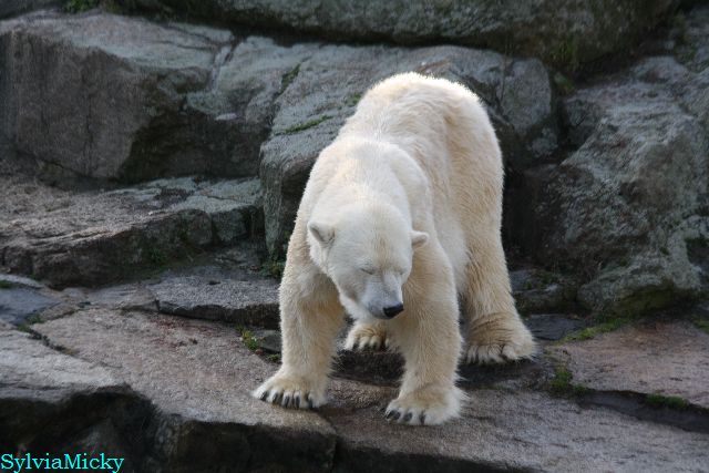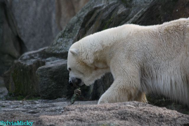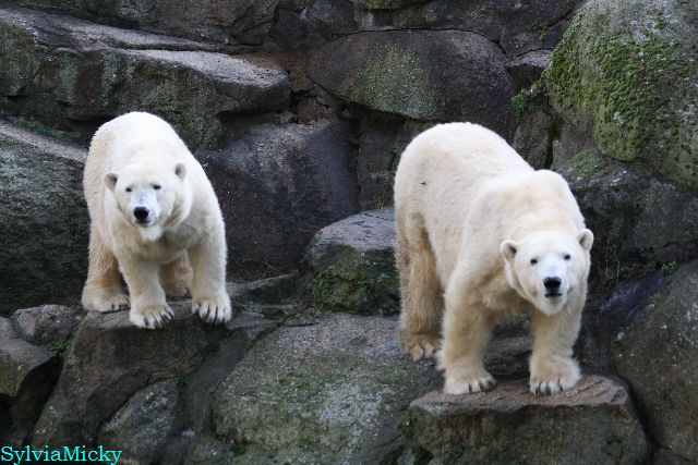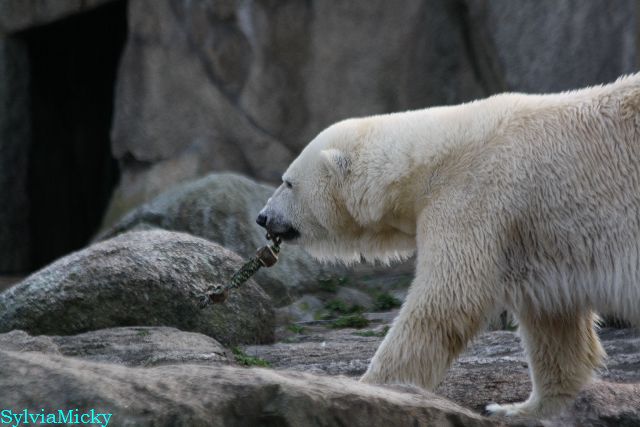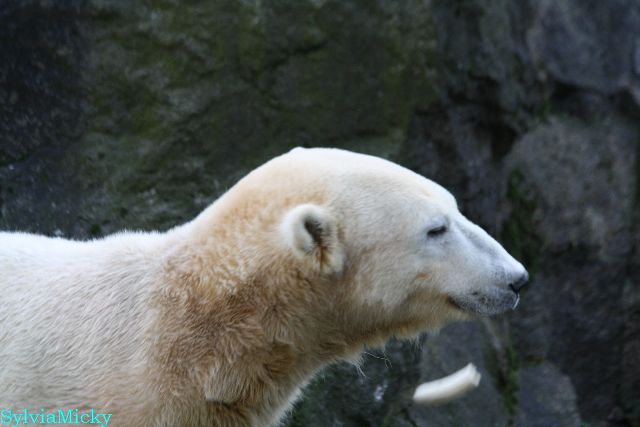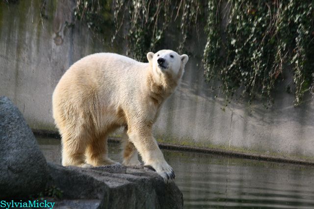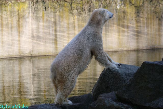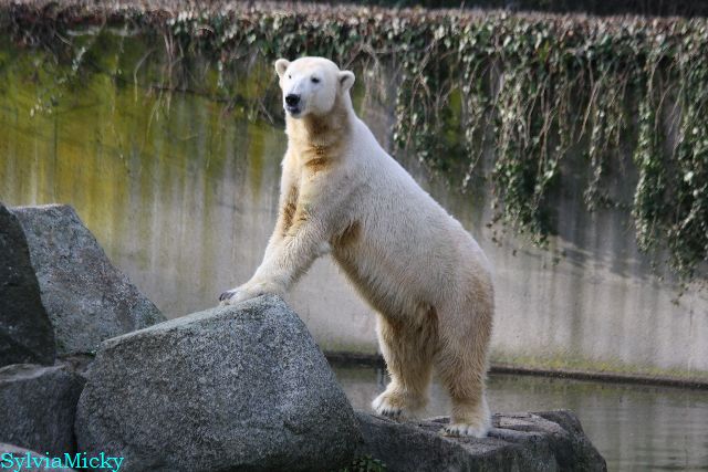 Knut ging danach auf die Anlage und stieg auf einen der hohen Felsen. Da kam Kati an. Sie stellte sich mit den Vorderpfoten an den Felsen und hob ihre Vorderpfote und brüllte laut. Knut brüllte mächtig zurück. Sie machte kehrt, ging dann doch wieder hin. Diesmal gab Knut nach.