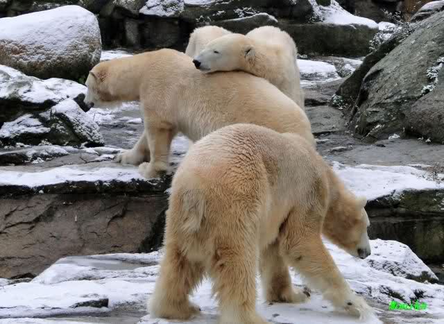 Heute Morgen lagen die drei Ladys dicht zusammen und freuten sich über den Schnee. Knut lag auf dem vorderen Plateau, sah den Damen zu und hatte natürlich auch Freude am Schnee. Er lag heute nur mal kurz vor der Fütterung auf seiner Ecke. Ansonsten lief er über die Anlage, lag auf Toscas`s Insel, fing Schneebälle und spielte im Wasser.