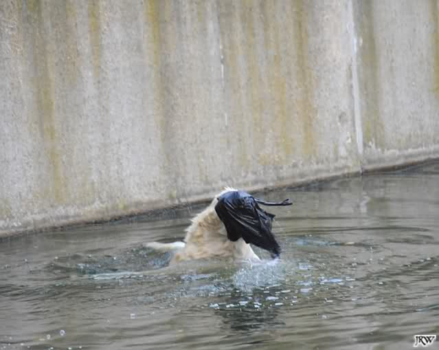 Knut brauchte wieder eine halbe Ewigkeit bis er im Wasser war. Dann tauchte er das Becken systematisch ab, und tauchte als erstes mit dem schwarzen Shirt auf.