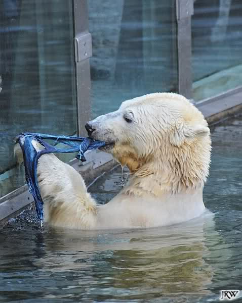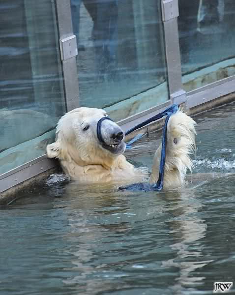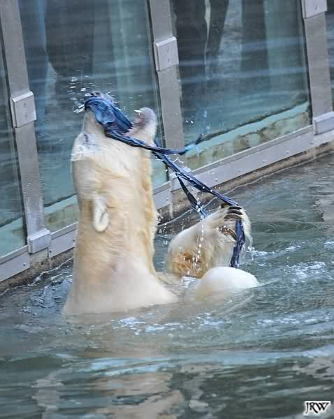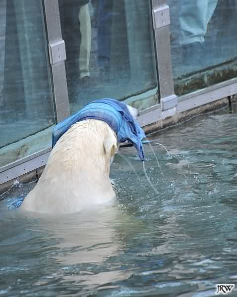 Knut spielte mit seinem Ball, dann fand er ein blaues Tuch mit dem er wirklich seine Freude hatte. Er zeigte es einem kleinen Kind an der Scheibe und dann auch allen anderen, die dort standen. Allerdings kann er damit schummeln, er kann durchsehen auch wenn er es über den Augen hat. Dann fand er sein T-Shirt und wickelte es sich um den Kopf. Das Fotografieren wurde schwierig, die Lichtverhältnisse wurden immer schlechter. Auf einmal holte er seinen geschundenen Ball und fing an ihn in Richtung Zuschauer zu werfen. Wir hatten neulich gerätselt ob er wohl die Schmollecke benutzen würde wenn er je wieder auf die Idee käme, den Ball zu werfen. Genau das hat er heute getan. Bis über die Mauer hat er es noch nicht geschafft, aber viel fehlte nicht. Sicher lag es auch an dem Ball, der nicht mehr soo rund ist. Als es schon praktisch total dunkel war, hörte er wohl den Pfleger und flitzte aus dem Wasser um Einlass zu finden. Wir waren bis zu dieser Zeit zu Eiszapfen mutiert.