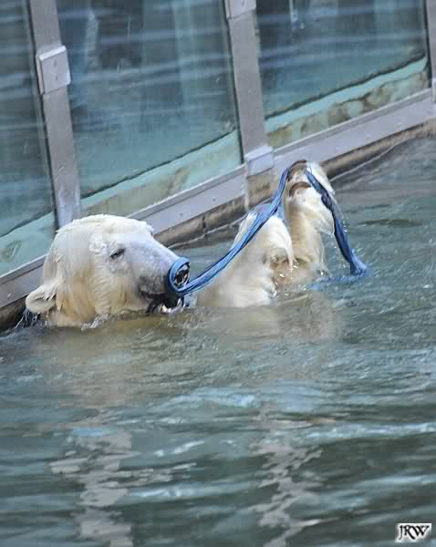 Inzwischen kamen auch Nancy und Tosca an. Angelockt von dem lautem Gebrülle. Mir kommt es manchmal so vor, als wenn Tosca Knut schützen will. Wie bei der Situation mit Nancy früh. Tosca schwamm, schaute Nancy an und so ging Nancy von Knut weg und lief Tosca, die immer noch im Wasser schwamm, auf der Anlage hinter her.