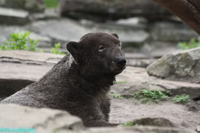 An einem total verregneten Tag waren unsere beiden Bärchen auch nicht bester Stimmung. Es wurde den ganzen Vormittag viel gelaufen und geschlafen. Nach der Fütterung kam Gianna wie von der Tarantel gestochen aus der Höhle gerannt. Sie fand allerdings nur noch eine Möhre im Wasser.