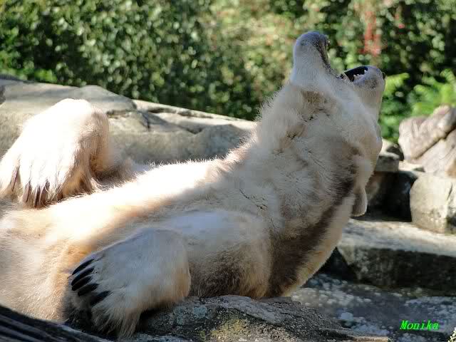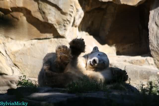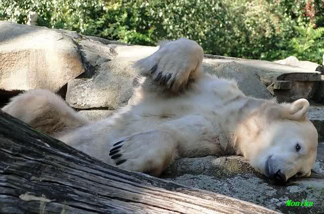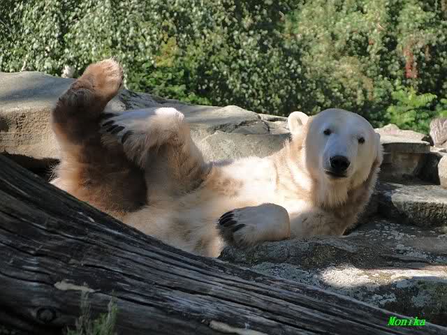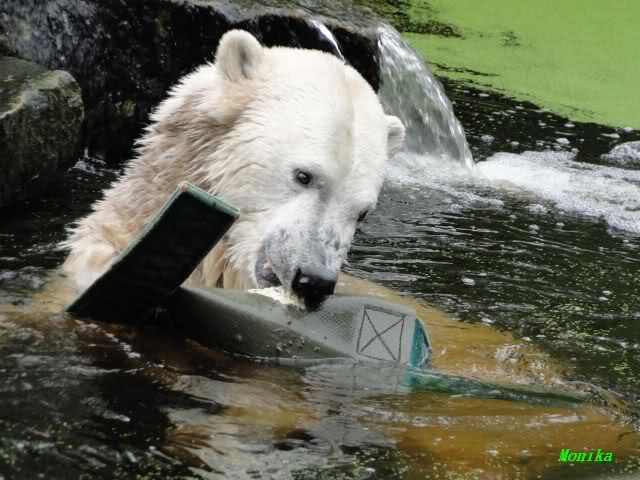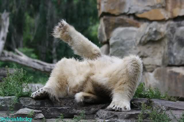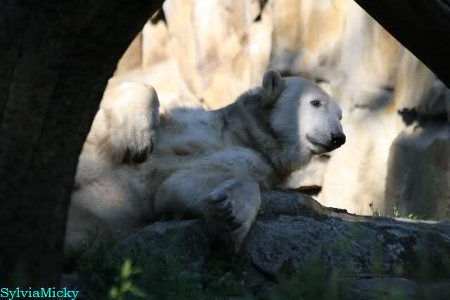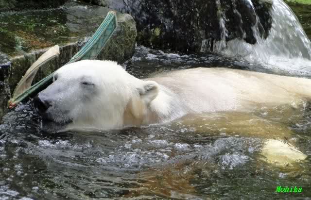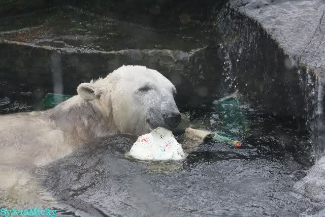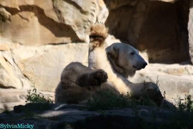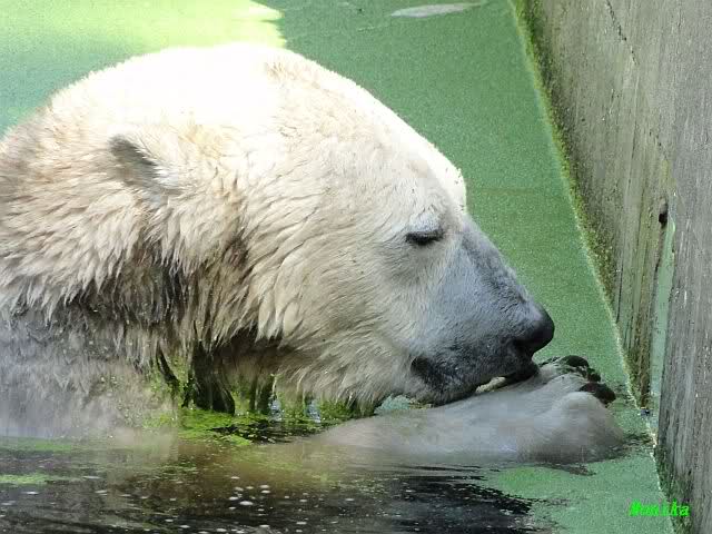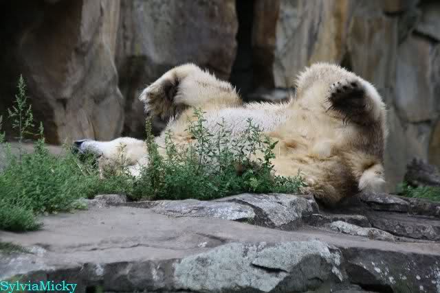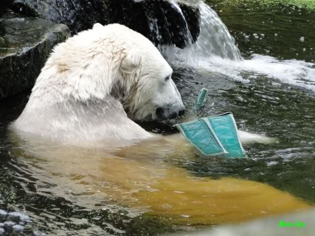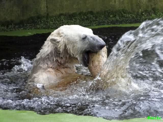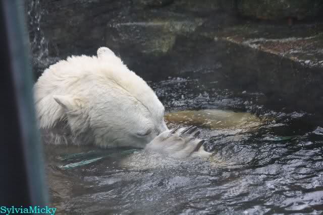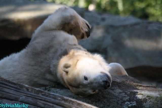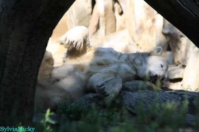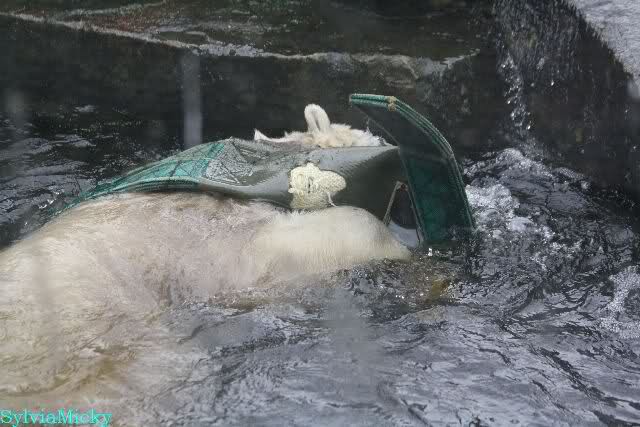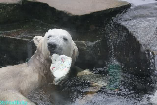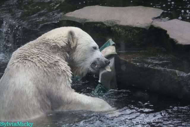 Wie Sylvia schon schrieb, schlief Knut heute Morgen. Er suchte sich immer wieder eine andere Position, und sah wieder so süß aus. Wie ein Engel. Nachdem er sich ausgiebig rekelte, ging er ins Wasser. Er fand unter anderem noch einen großen Fisch von gestern. Sehr zur Freude aller Besucher, spielte er auch heute mit seinen Gästen Ball.