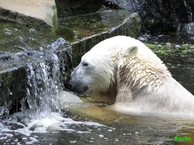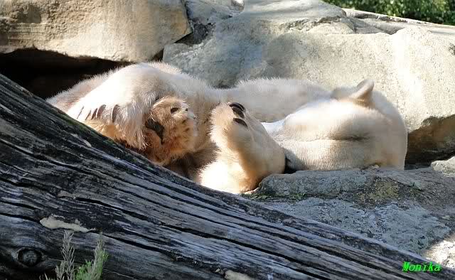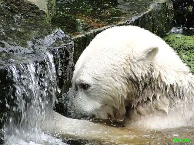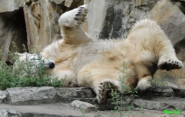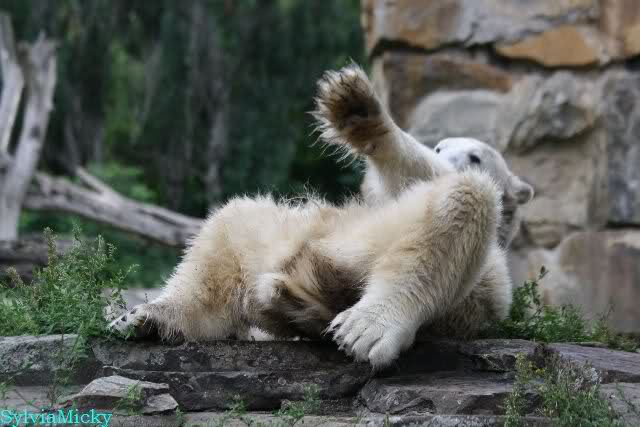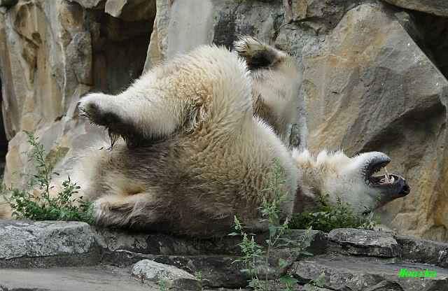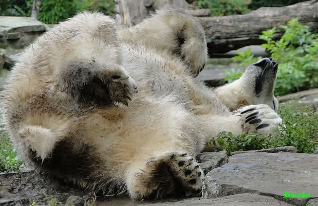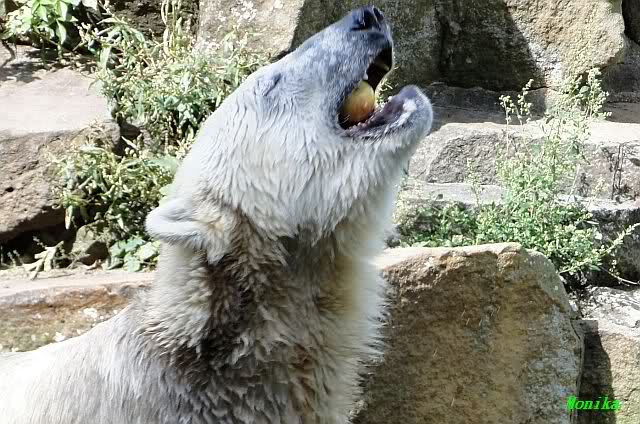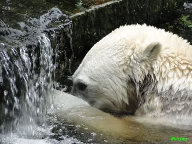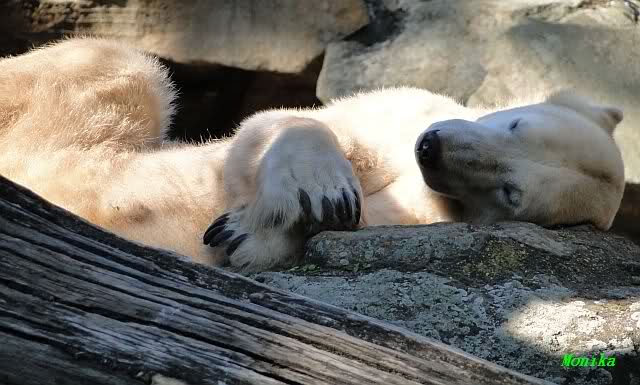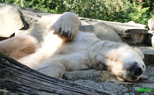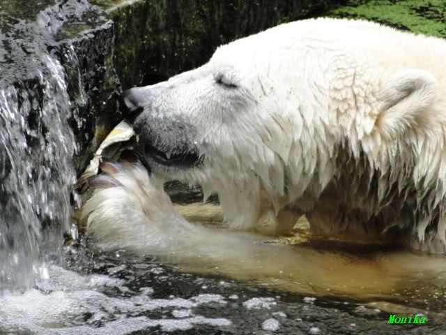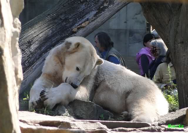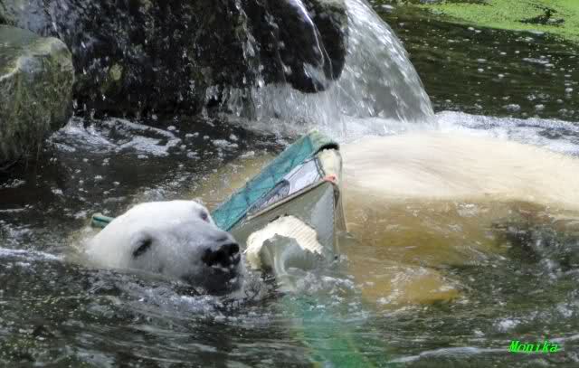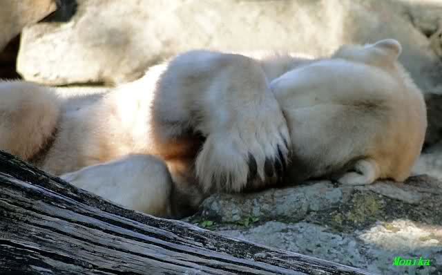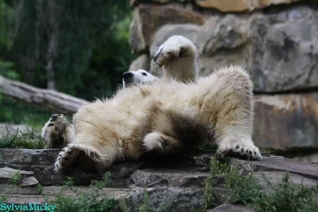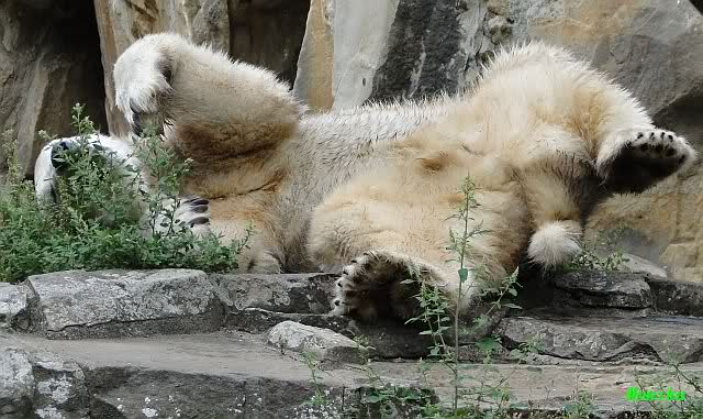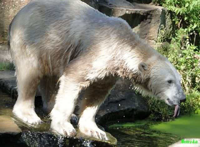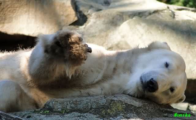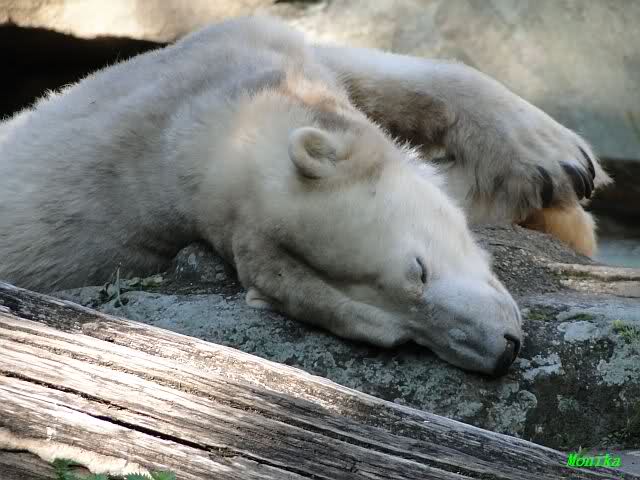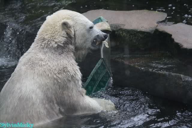 Wie Sylvia schon schrieb, schlief Knut heute Morgen. Er suchte sich immer wieder eine andere Position, und sah wieder so süß aus. Wie ein Engel. Nachdem er sich ausgiebig rekelte, ging er ins Wasser. Er fand unter anderem noch einen großen Fisch von gestern. Sehr zur Freude aller Besucher, spielte er auch heute mit seinen Gästen Ball.