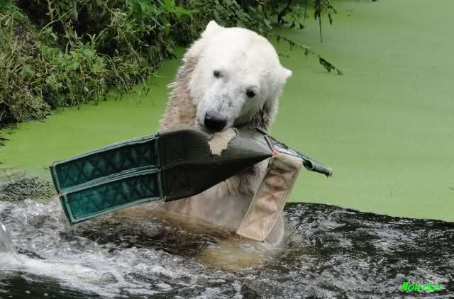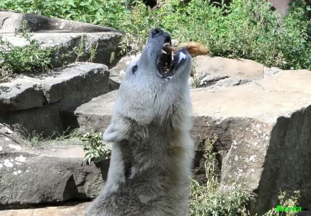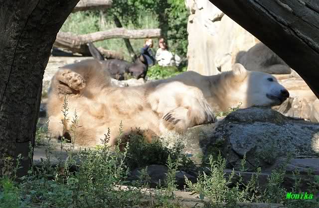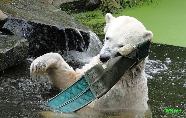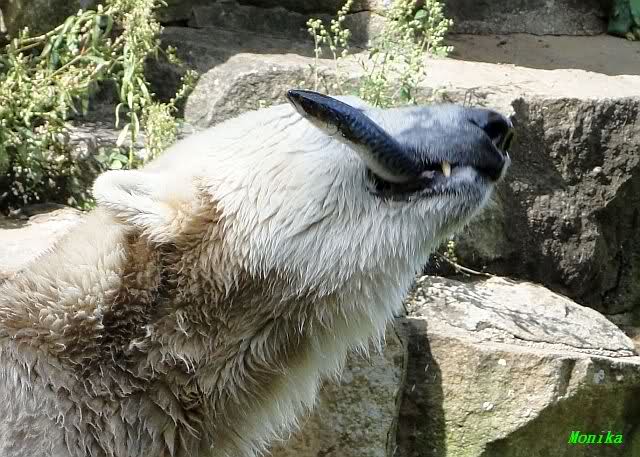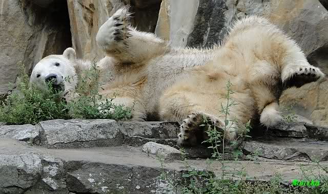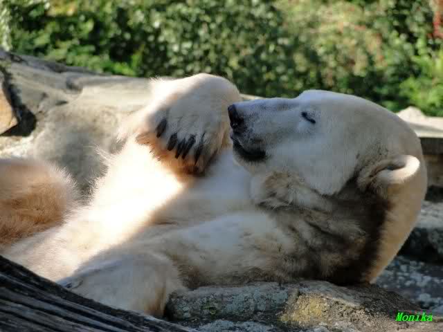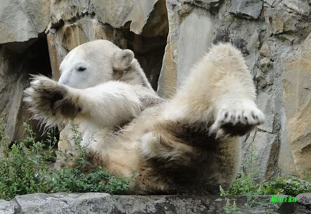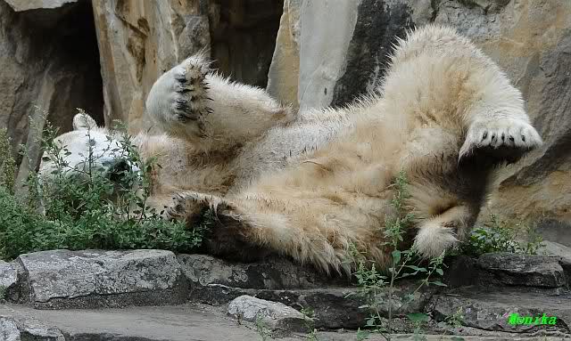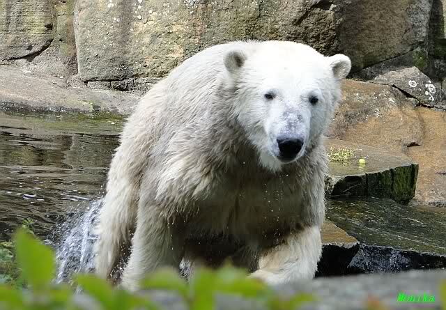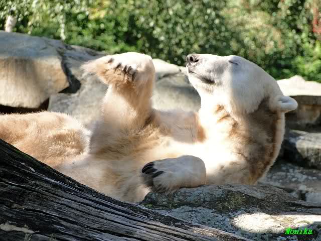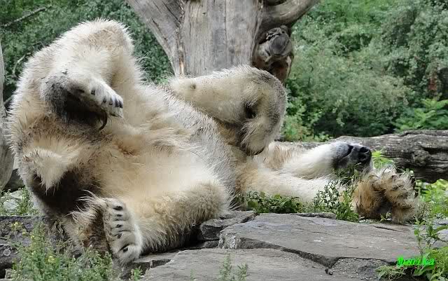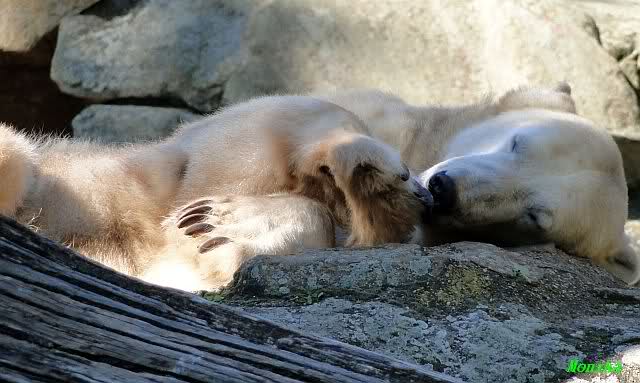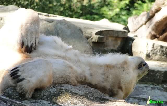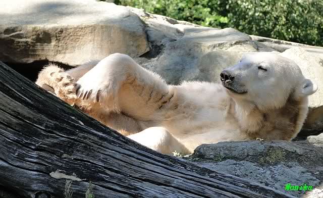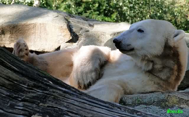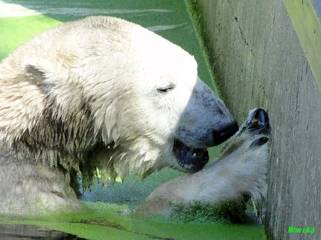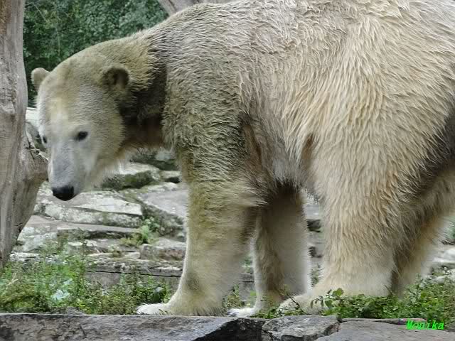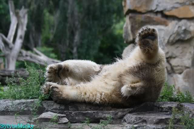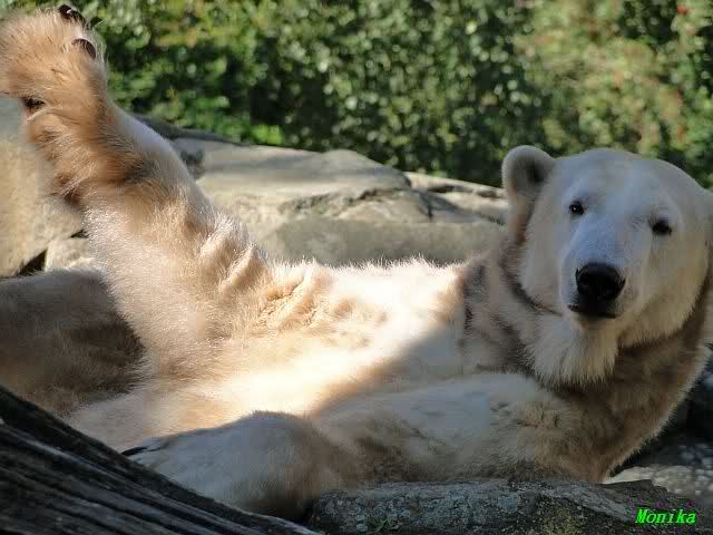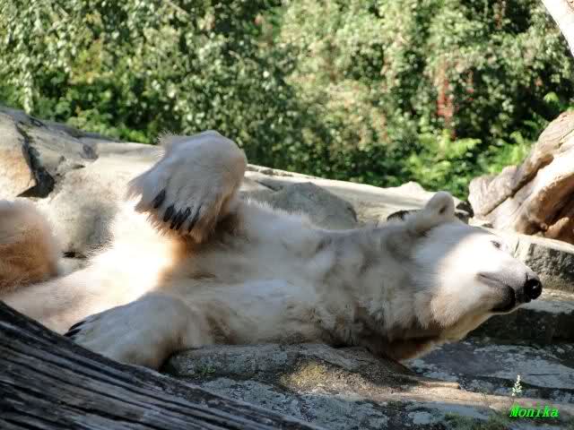 Wie Sylvia schon schrieb, schlief Knut heute Morgen. Er suchte sich immer wieder eine andere Position, und sah wieder so süß aus. Wie ein Engel. Nachdem er sich ausgiebig rekelte, ging er ins Wasser. Er fand unter anderem noch einen großen Fisch von gestern. Sehr zur Freude aller Besucher, spielte er auch heute mit seinen Gästen Ball.