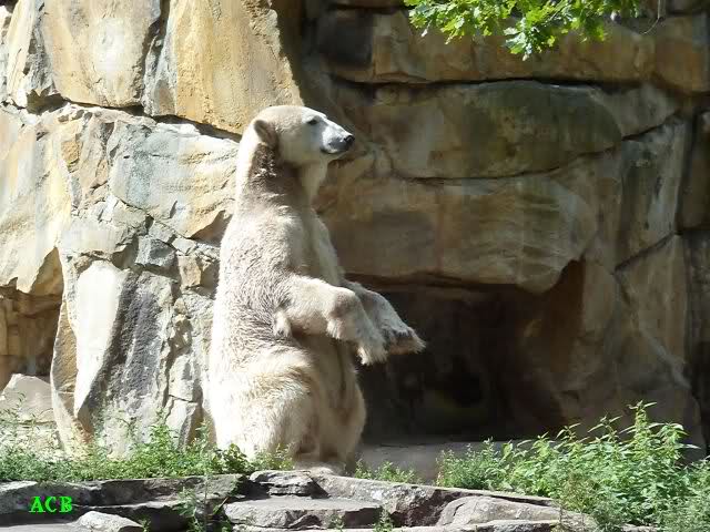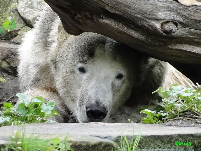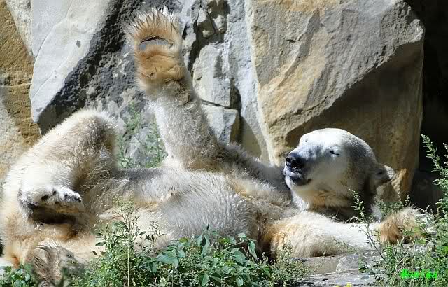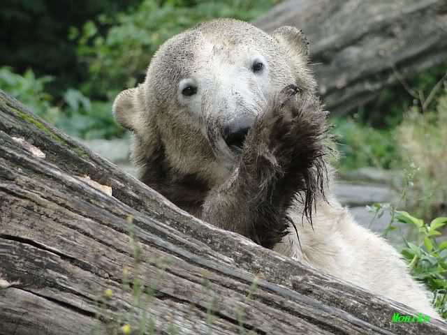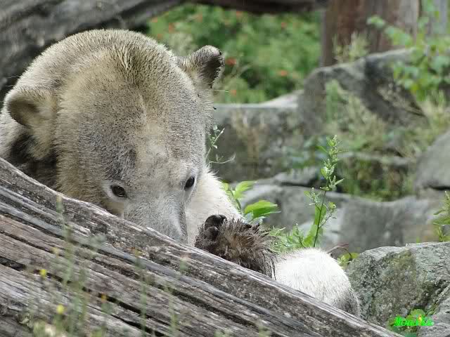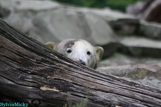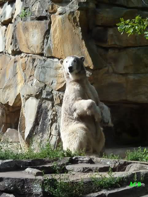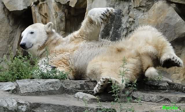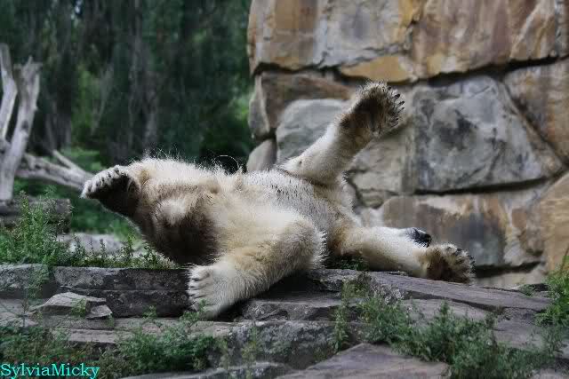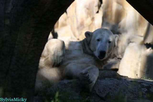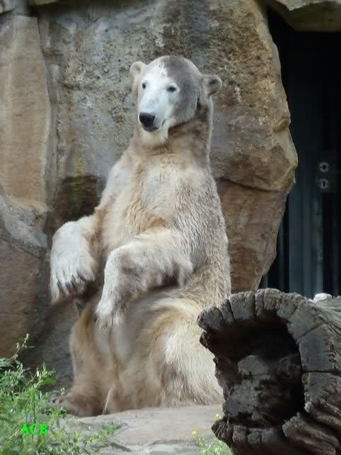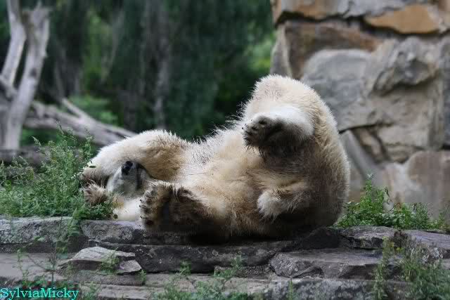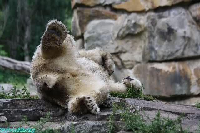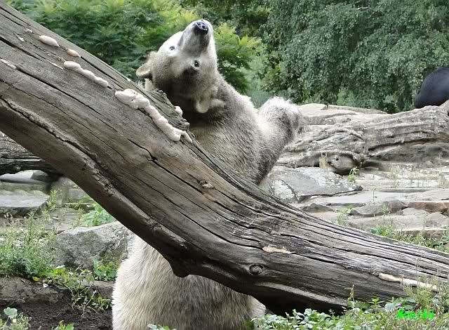 Heute Nachmittag kam ich (Anne)bei strahlendem Sonnenschein in den Zoo,wohin?,natürlich zu Knut, denn das brauchte ich nach dem schweren Dienst (auch "Rentner" gehen arbeiten)Immer wieder erfreut es mein Herz, wenn sooo viele Menschen bei Knuti stehen, und sich an ihm erfreuen. Da lag er in seiner Sand Kuhle und sonnte sich ganz genüsslich. Er sah so klein und Schutz befohlen aus, ja, er ist halt doch noch ein Halbstarker. Gegen die drei Mädels ist er ja noch sehr klein, und ich mag gar nicht daran denken, dass er es mit diesem eingespielten Trio aufnehmen muss!!! Schön, das von Nah und Fern so viele liebe Knut-Fans angereist sind, herzlich willkommen in Berlin bei unserem Star "Knut"!!! Nicht war, es lohnt sich immer wieder, egal wie weit man fahren muss, denn Knut ist doch jede Strapaze wert, oder??? Liebe Gisela-Sylvia-Monika "DANKE" für die wunderschönen Bilder!!! Am besten haben mir die gefallen, wo er so richtig "rum-fleetzt", einfach das Bären Leben genießen, so lange es noch geht in "seinem Paradies"!!!