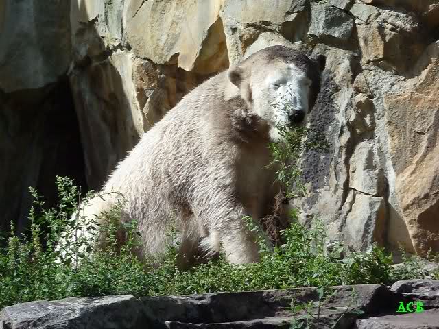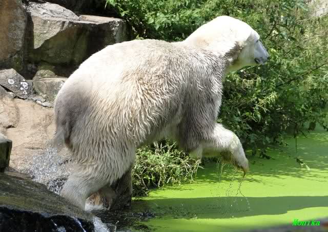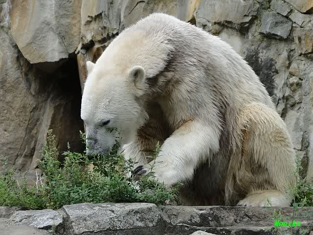 Heute Vormittag lag Knut auf dem Stein und schlief. Dann reckte und streckte er sich und war erstaunt über die vielen Besuchern an seinem Gehege. Gegen Mittag war kein Platz mehr direkt am Gehege zu bekommen. Knut ging dann in den Wassergraben und fand noch Reste von gestern.