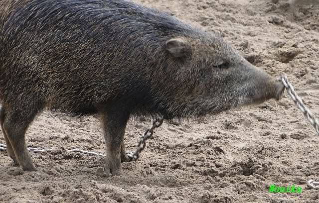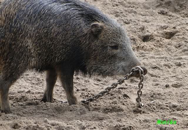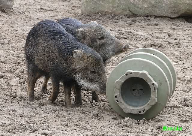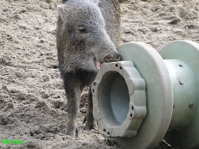 Bei den Pekaris gab es heute die "Futter-Rolle". Wenn die Schweine die Rolle bewegen, kommen aus den Löchern Leckerlis heraus.