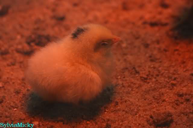 Ein weißes Hühnerküken mit einem schwarzen Fleck auf dem Kopf unter der Rotlichtlampe