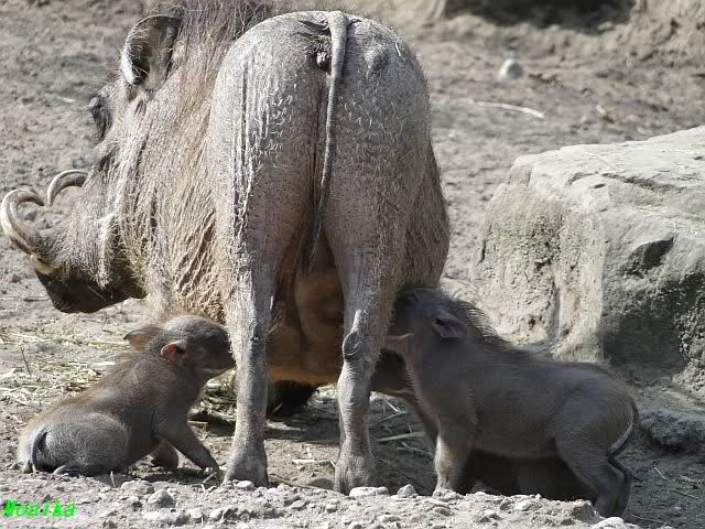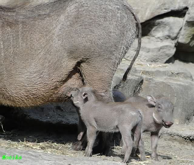 Die drei kleine Warzenschweine beim Frühstück an der Milchbar