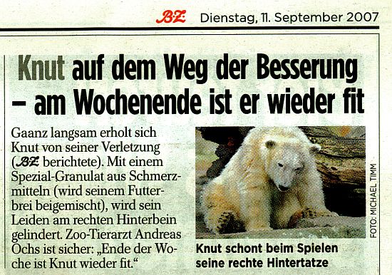 Knut is recovering very slowly. He gets special painkillers with his food, to ease the pain in his right back paw. Zoo Vet Dr. Andreas Ochs says. he is sure that Knut will be alright by the end of this week.