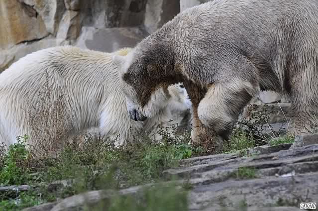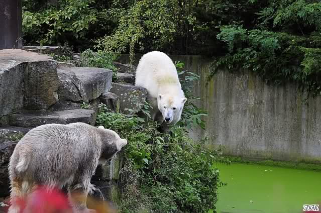 Schöne Bilder wieder von den beiden! Es ist schön, dass sich die beiden vertragen. Bald werden sie (vor allem Knut) ihre Scheu voreinander ganz abgelegt haben. Mal sehen ob wir dann einen weißen Knut sehen oder ob er Gianna davon überzeugt, dass es auch andersfarbige Eisbären gibt.