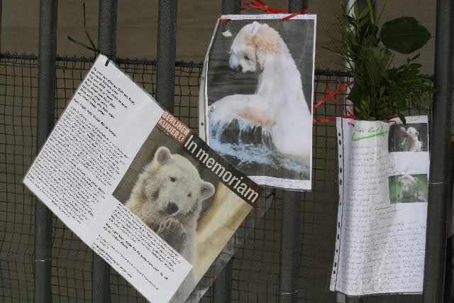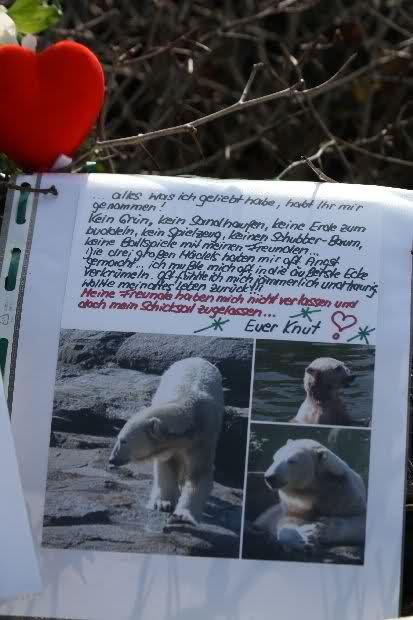 Denn die weltweite Beachtung und Anteilnahme, die sein früher Tod auslöste zeigt, dass auch der langsam ins adulte Alter heranwachsende Bär nicht vergessen worden war. Etlichen war sein Schicksal nicht gleichgültig, sie besuchten ihn regelmäßig und setzten sich für verbesserte Haltungsbedingungen ein. Dieser Traum von einer innigen Wildtier-Mensch Beziehung, von Zugewandheit, Fürsorge und Freundschaft berührte Menschen nachhaltiger und tiefer als es jedes erfundene, kommerzielle Entertainmentspektakel vermögen würde. Das finde ich beruhigend. Ebenso, dass menschliche Werte auch das Fremde und Andersartige miteinschließen können, mithin nicht auf die eigene Art beschränkt bleiben. Der Eisbär und sein Pfleger waren bekannt, hatten einen Charakter, ein Gesicht. In der Konstellation und als Sympathieträger schafften sie es spielend Gefühle zu wecken. Wenn Menschen in Japan gerettet werden, ist das eine gute Botschaft, eine ermutigende Information, doch zu den Geretteten besteht keinerlei Beziehung, sie sind unbekannt. Naturgemäß kann so eine Nachricht nicht spontan Tränen wecken. Wer traurig ist über Knuts unerwarteten Tod, muß nicht notwendigerweise ignorant sein gegenüber den Bedrohungen, Leiden und Vorgängen in der Welt, wie es gern suggeriert wird. Der emotionale Haushalt und die Wahrnehmung des Menschen funktioniert weit weniger eindimensional und monoman als Kritiker anprangern. Trotz des Entsetzens über die apokalyptischen Zustände in Japan und das Leid der Betroffenen, trotz des bedrohlichen GAUs, kriegsähnlicher Zustände,..- die Liste ist lang, gibt es auch weiterhin vergossene Tränen über verlorene Fußballspiele etwa. In der von Katastrophen, Krieg und Politik geprägten Nachrichtenlage, konnte ich auch keine Dominanz des Knut-Themas ausmachen. In den Medien über die ich mich informiere, war das Ableben des berühmten und beliebten Bären eine Randnotiz. Um näheres zu erfahren, musste ich am Sonntag wiedereinmal online suchen...