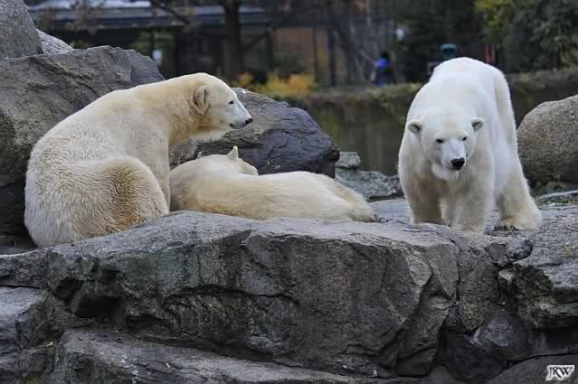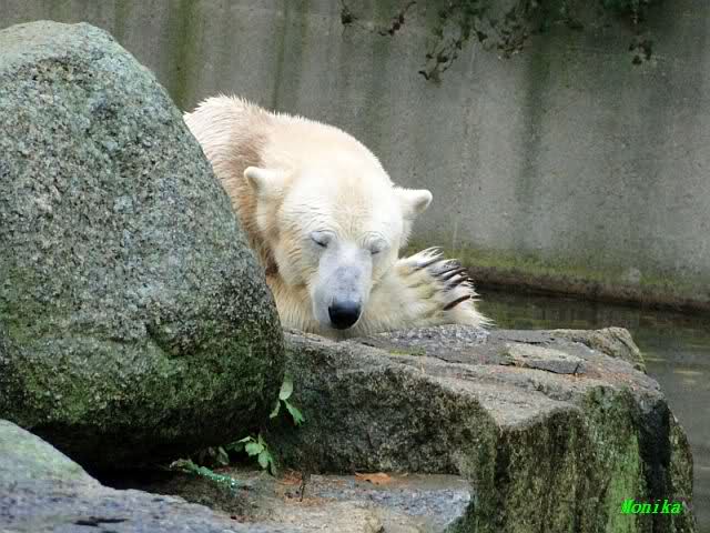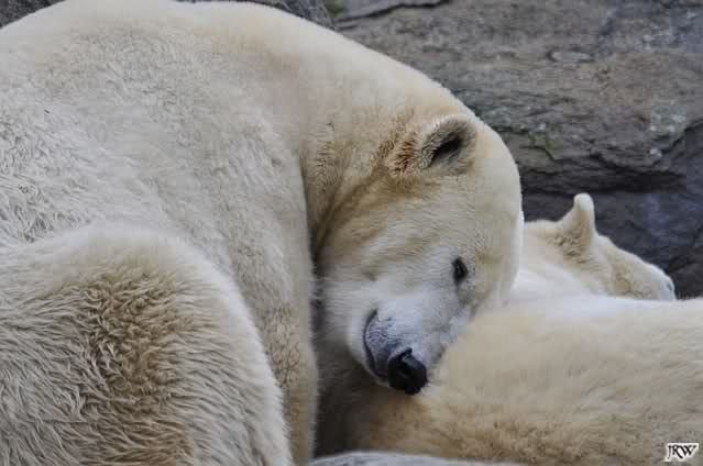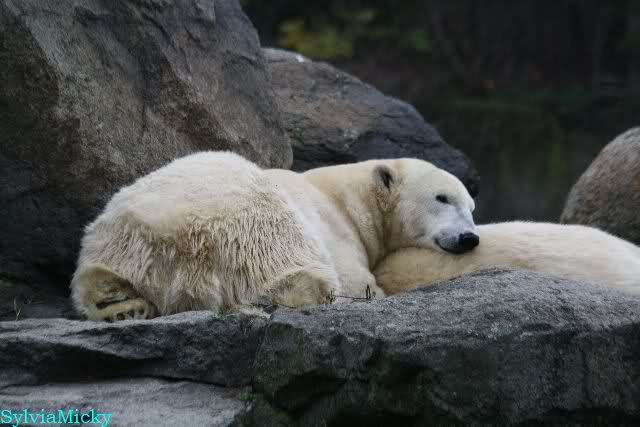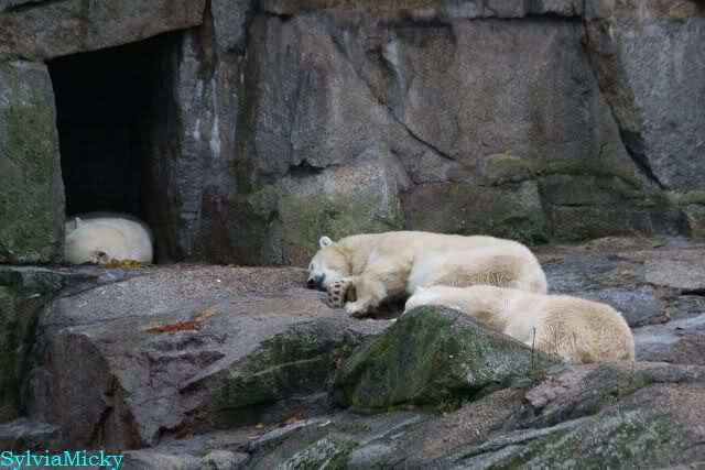 Offensichtlich hat das mehr als reichliche Futter der letzten Tage das Quartett heute müde gemacht. Es gab immer wieder wunderschöne Szenen der Schmusebacken Nancy und Tosca. Kati überlgte mehrere Male ob sie Knut aufsuchen sollte oder nicht. Er hört sie schon von Weitem und macht sofort seine Tapirlippe. Sobald Kati sich umdreht, sieht er wieder unschuldig lieb aus. Eben Knut. Was noch geschah als die Mädels weg waren, kann ich nicht sagen. Unter Umständen hat er dann aufgedreht.