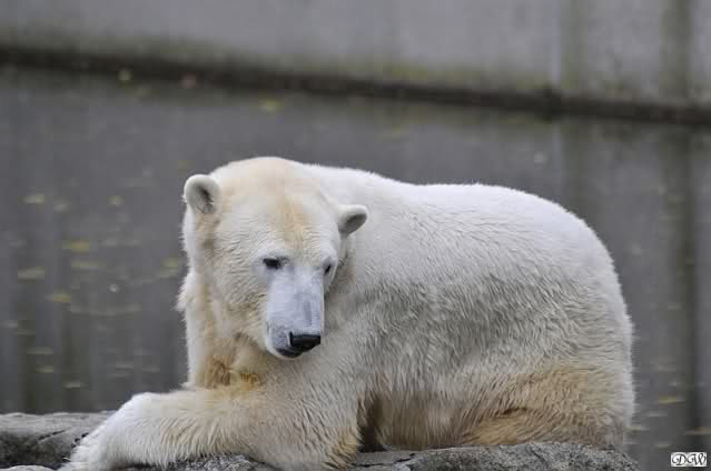 Nach der Fütterung hatte ich den Eindruck, daß Knut schon gerne auf die Anlage gegangen wäre aber sich wegen der Drei nicht traute. Also legte er sich wieder auf die vordere Ecke.