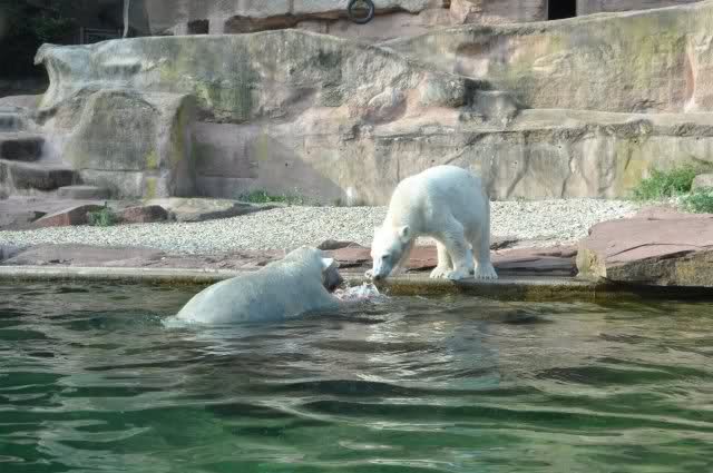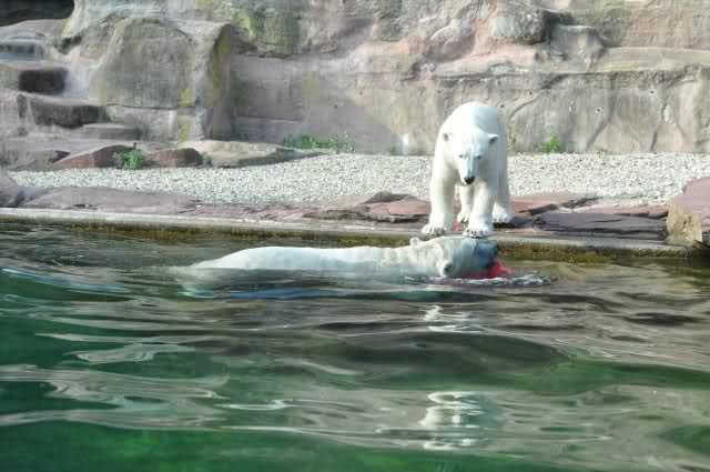 Als Zusatzverpflegung gab es Mais. Über den machten sich beide mit großer Begeisterung her, allerdings wollte Flocke nicht ins Wasser sondern versuchte, vom Rand aus einige Halme zu ergattern. Da Rasputin etliche Halme in Ufernähe verlor hatte sie damit auch Erfolg.